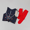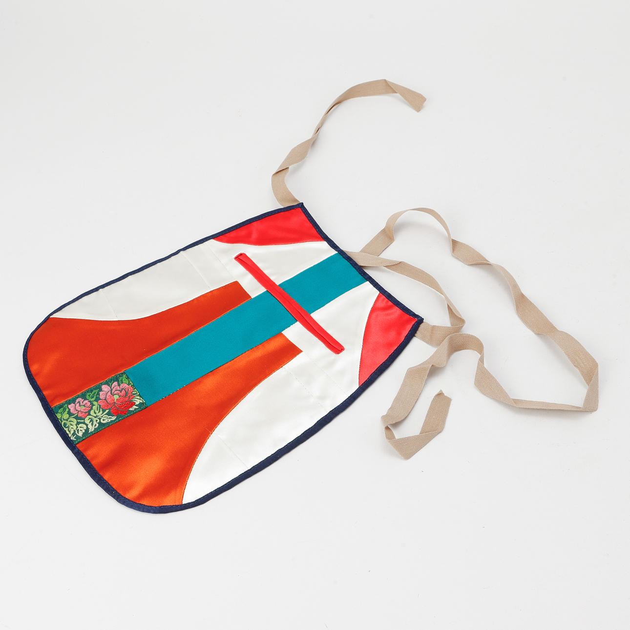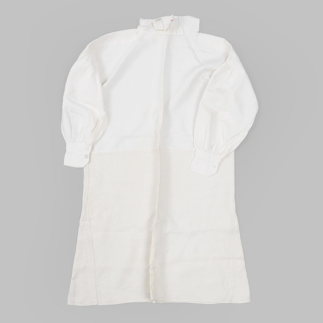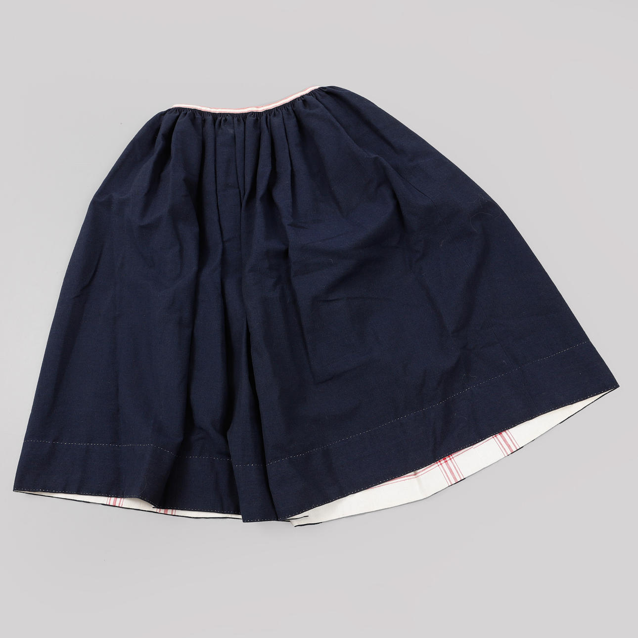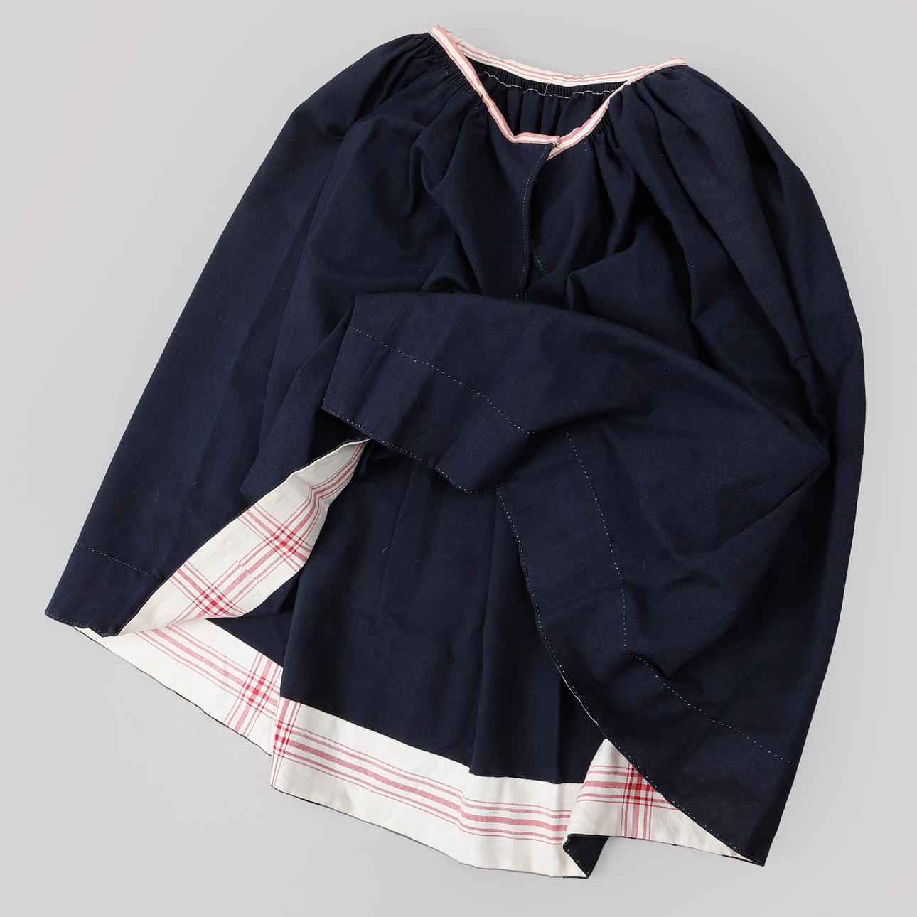 Kjol, blus/underklänning, livstycke, 2 förkläden, mössa, strumpor, väska, samt diverse stuvbitar. Kjollängd ca 90, midjemått ca 35 + 35 cm. Livstycke rygglängd ca 50, bystmått ca 47 + 47 cm.