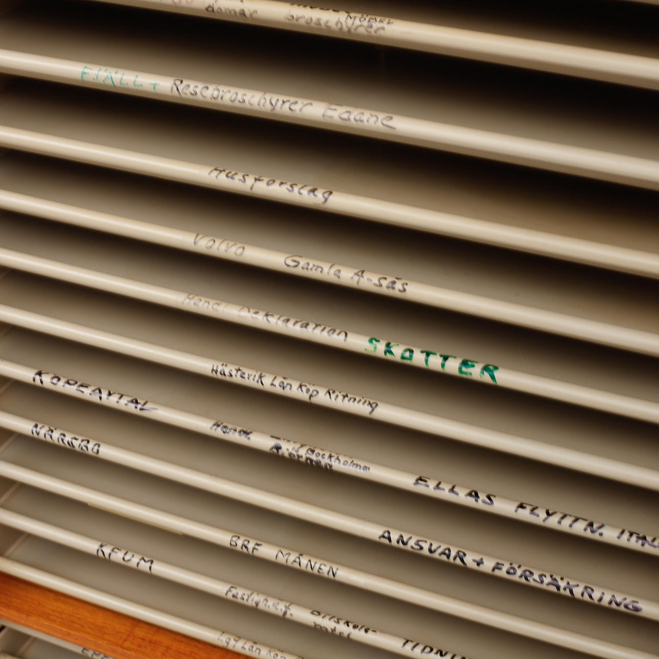 Bruksslitage, repor, uppmärkta indexhyllor.