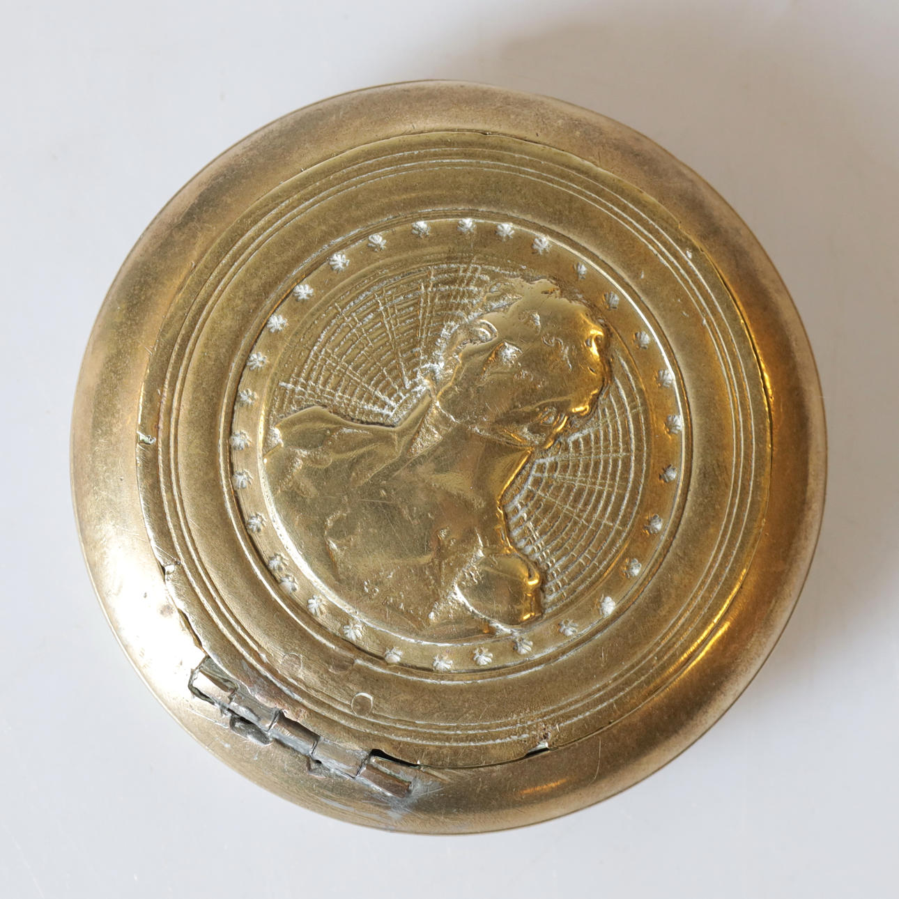 Med präglat porträtt på lock. Troligen föreställande Arthur Wellesley, 1:e hertig av Wellington. Diameter ca 8 cm.