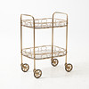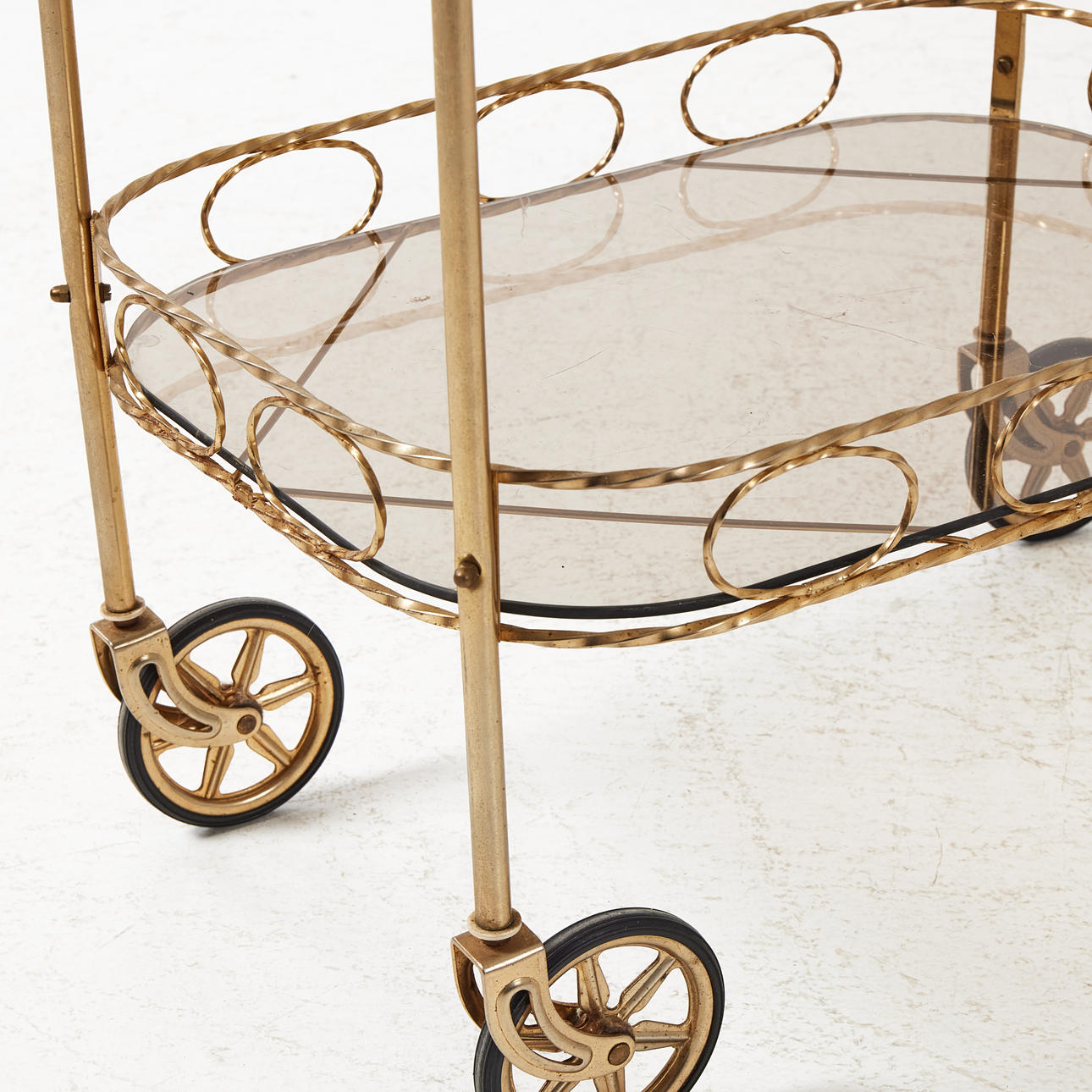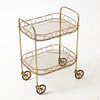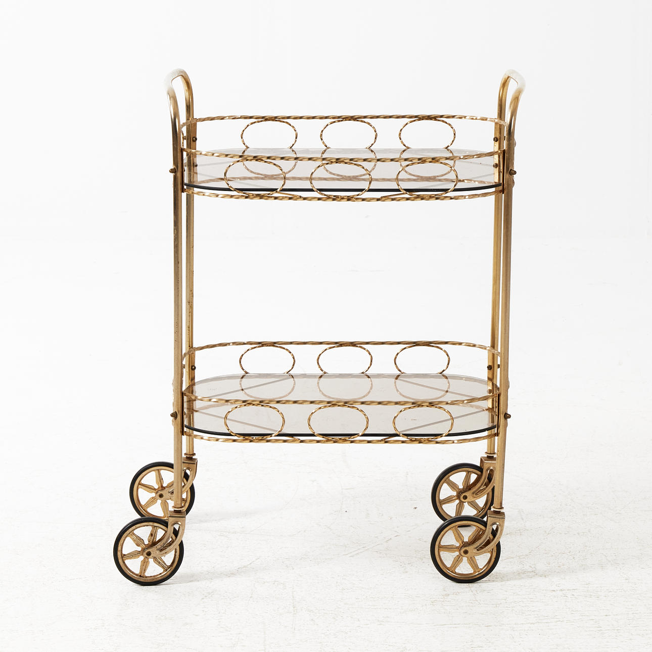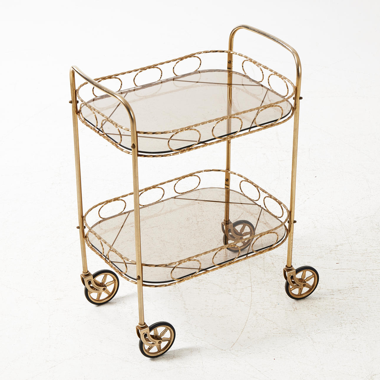 Två hyllor med röktonat glas. Genombruten naturalisk dekorkant. Hjultrissor. Hjul med gummi. Längd 53 cm, bredd 37 cm, höjd 74 cm.