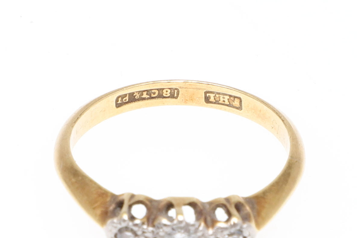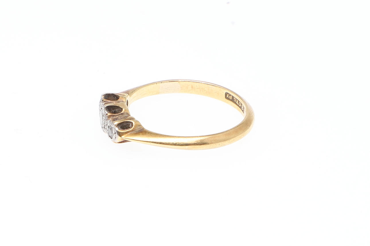 18ct ring lätt illusion infattad med tre diamanter, storlek I 1/2, 2.2g.