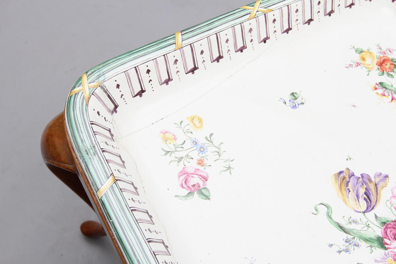 Rokokostil. Dekor av blommor. Ställning i trä. Längd 83, bredd 60, höjd 65 cm.