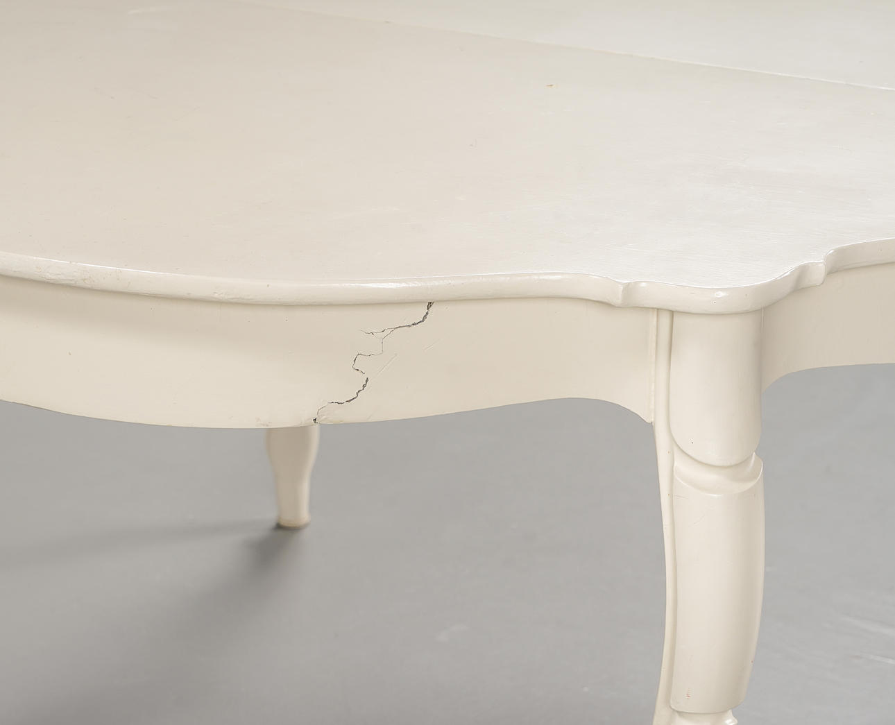 Slitage, skavmärken och färgbortfall, bordssargen med sprickor, bordet sviktar med 3 iläggsskivor, sitsar med några mindre fläckar.