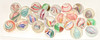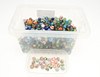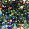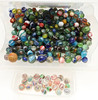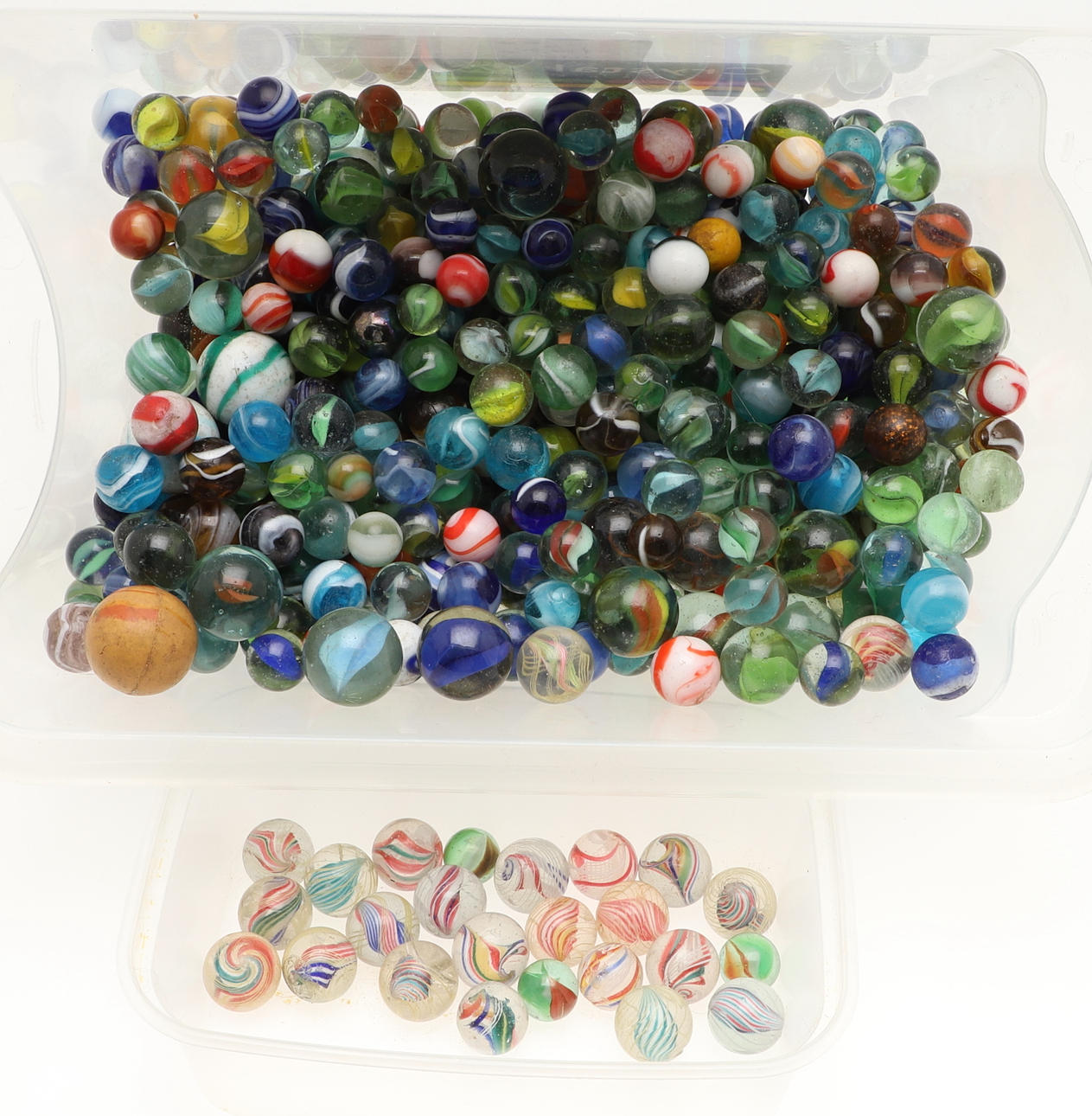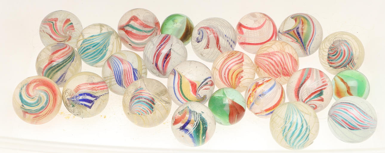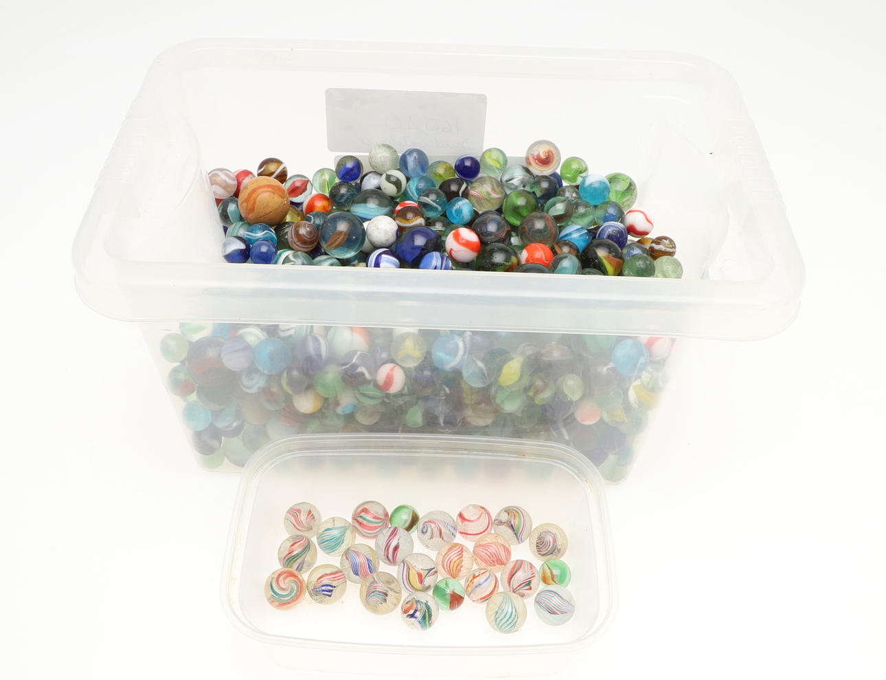 Ett stort antal glaskulor, inklusive några handblåsta latticino-exempel, vita och färgade glasexempel, och stort antal maskintillverkade kulor.