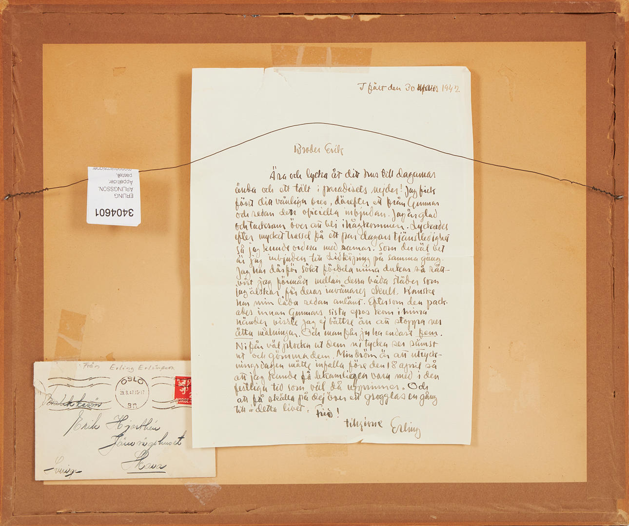 Brev från Ärlingsson till Erik Hjorthén i Skara medföljer.
