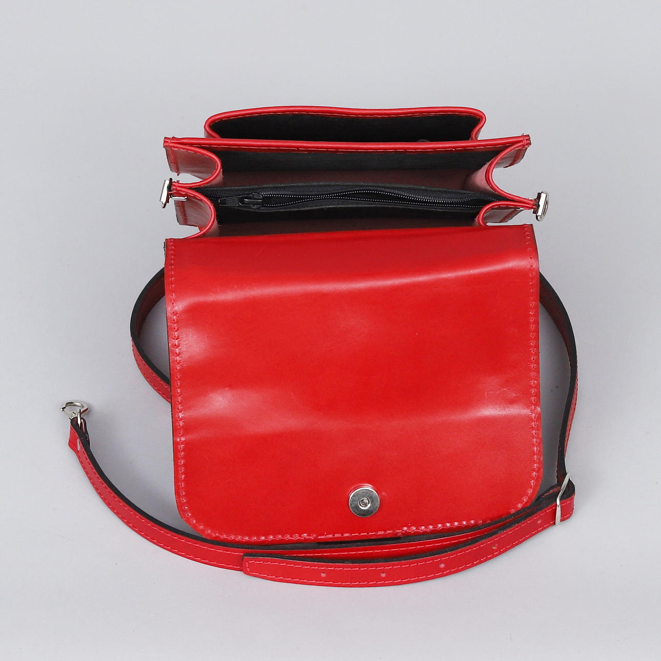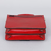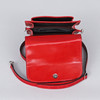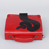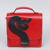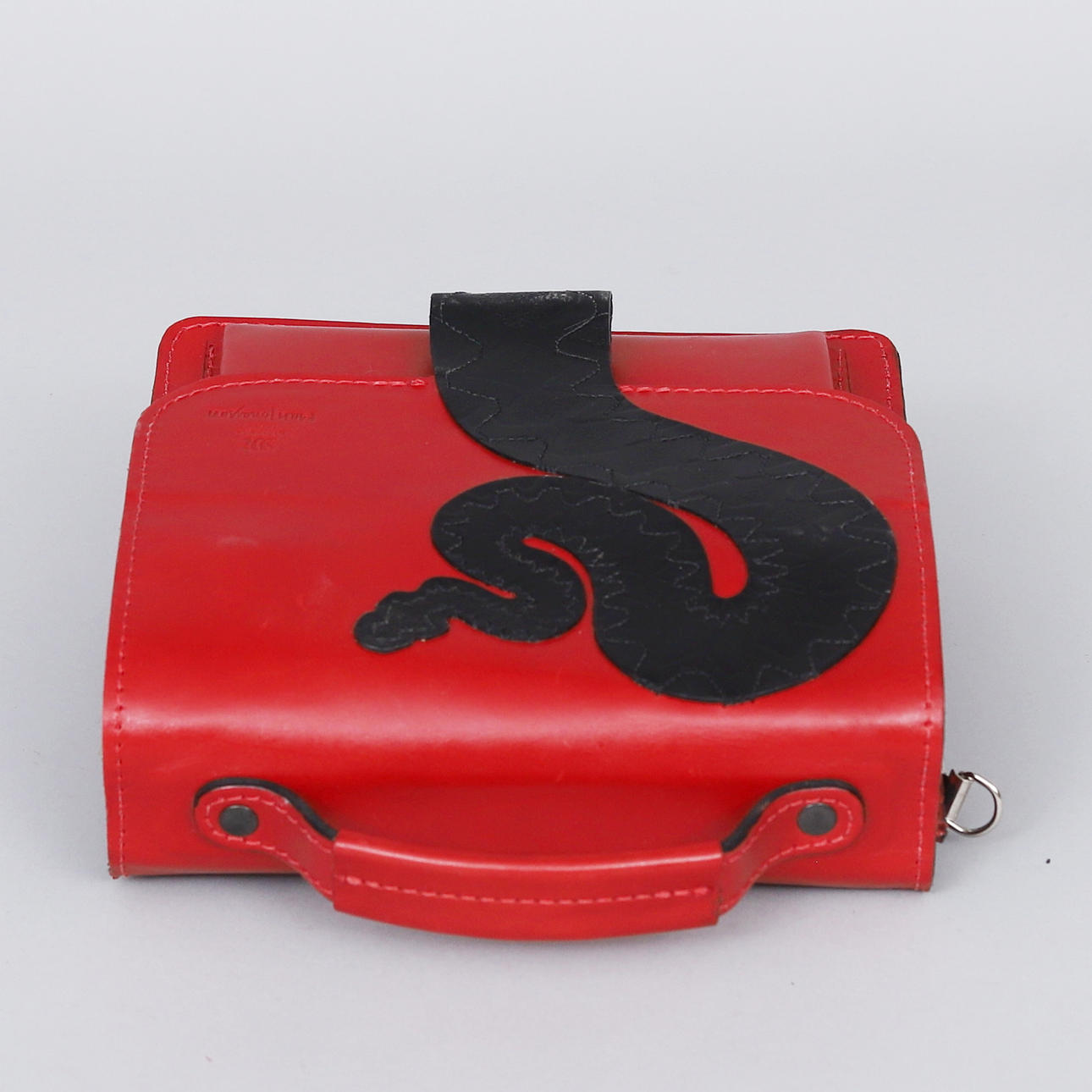 Handväska i rött läder med applikation av huggorm i svart präglat läder. Stämpelmärkt på lock. Medföljande axelrem.