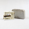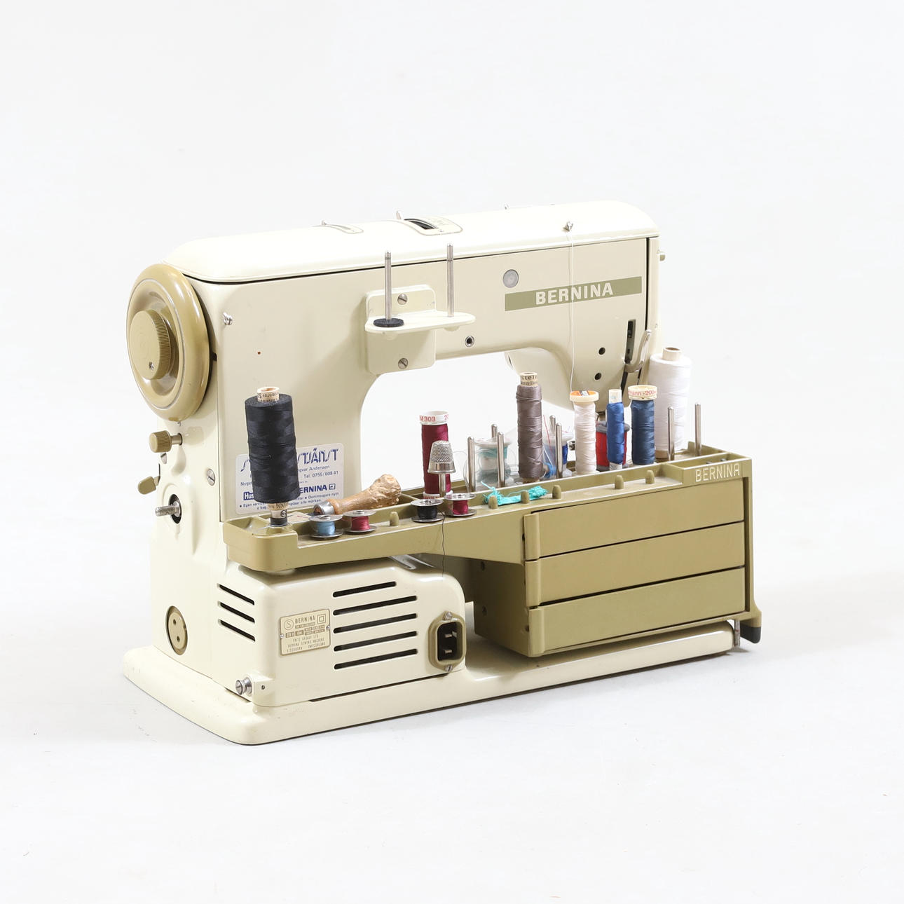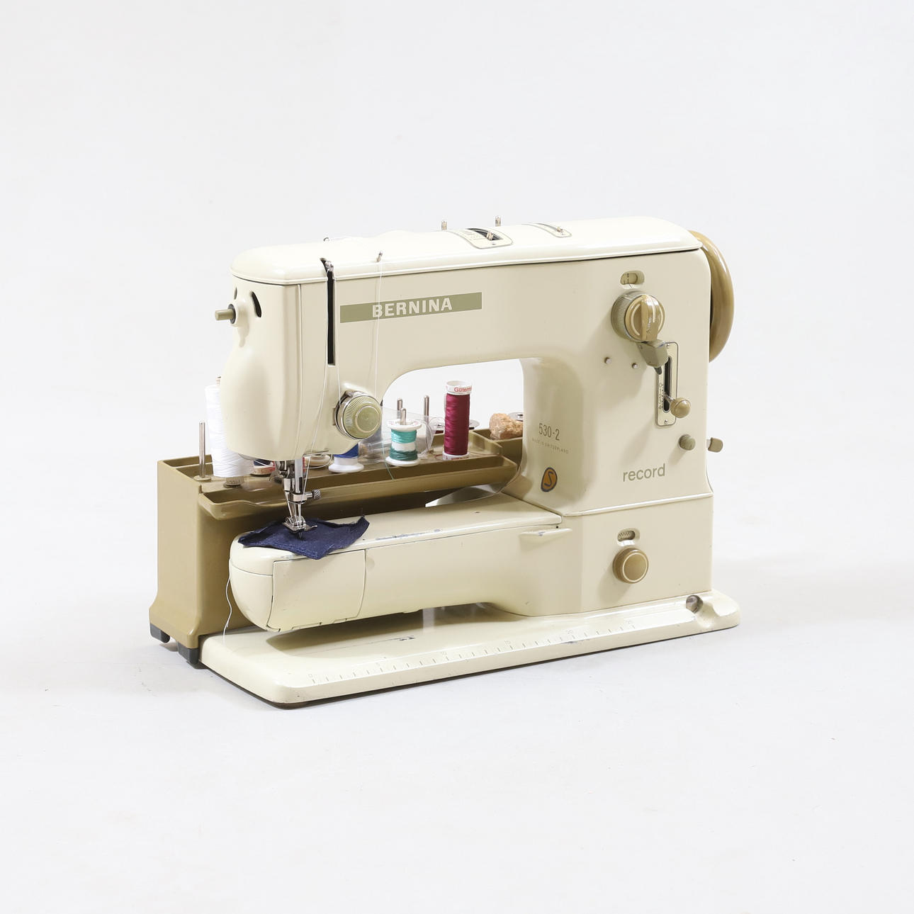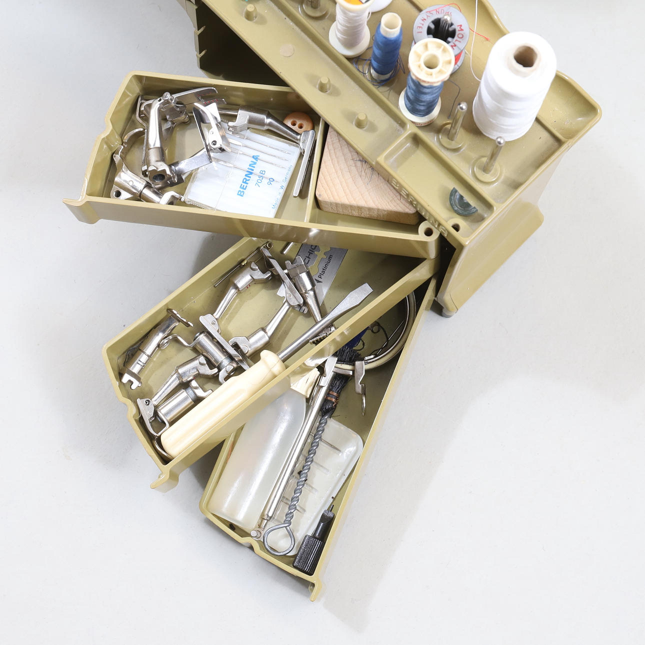 Med tillbehör bl a olika pressarfötter, samt väska och instruktionsbok.