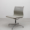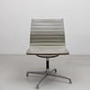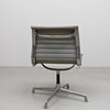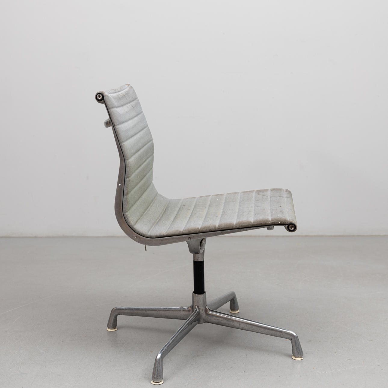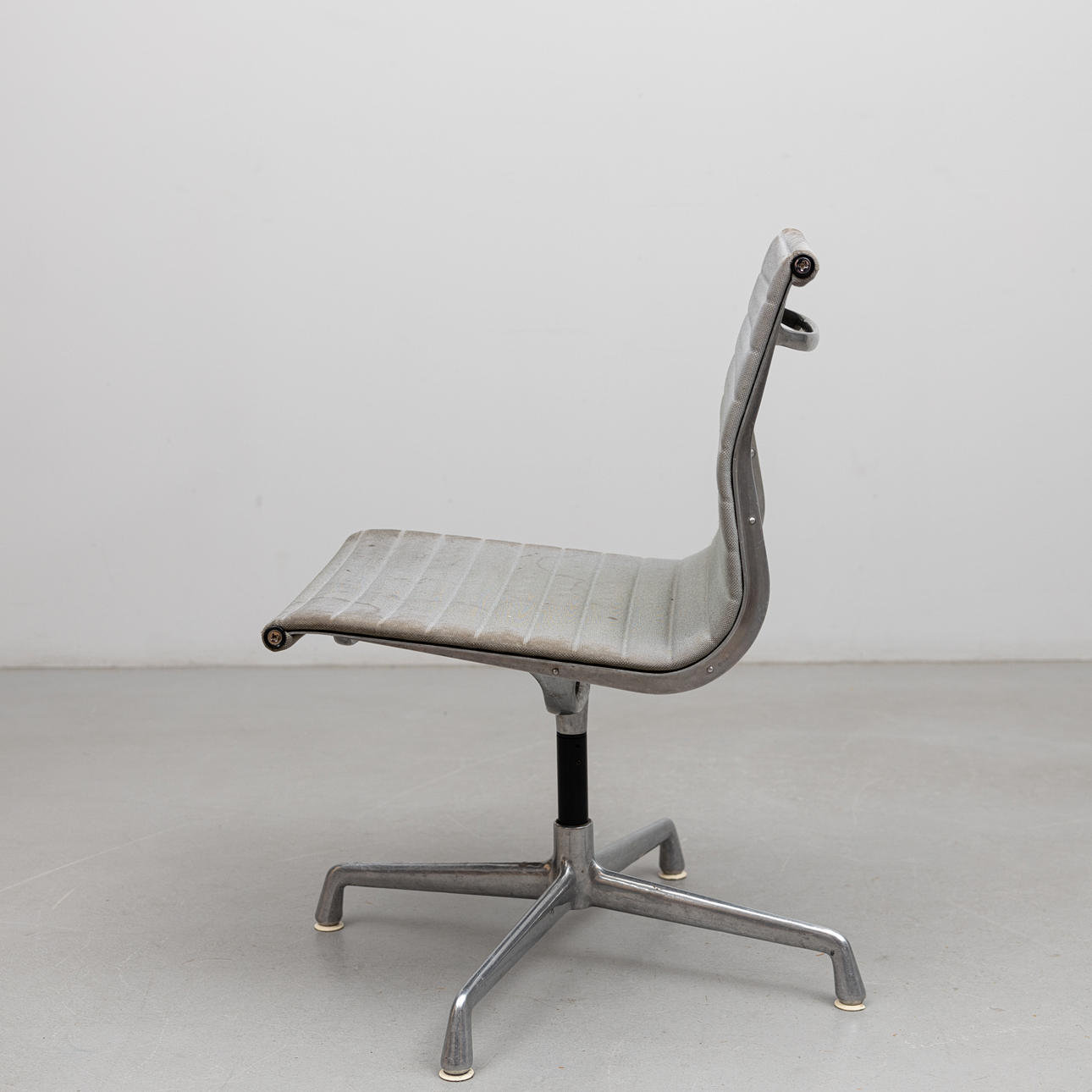 Klädda och stoppade sitsar grå canvas. Snurrbar stomme i aluminium. Sitthöjd ca 44, rygghöjd 83 cm.