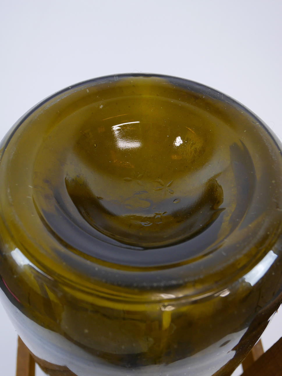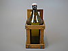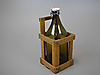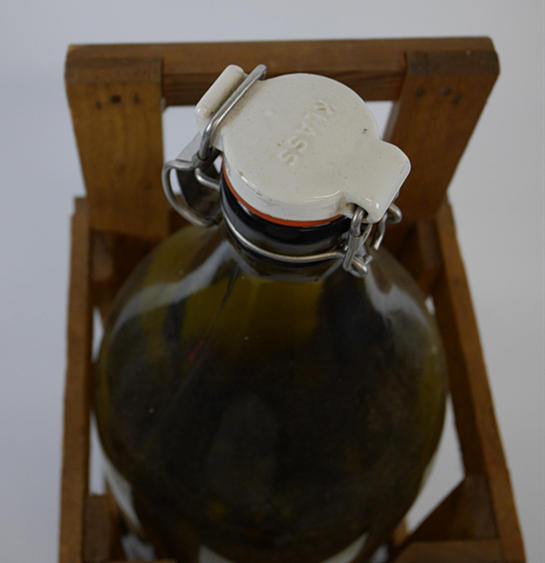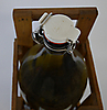 Med lufttät kork och skyddande träställning. Mått flaska: Höjd: 44 cm, Diameter: 17 cm.