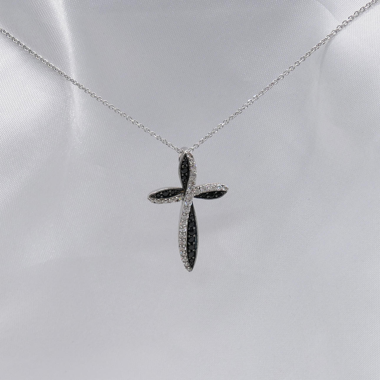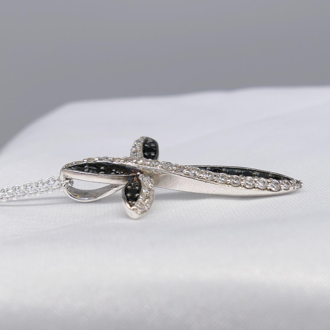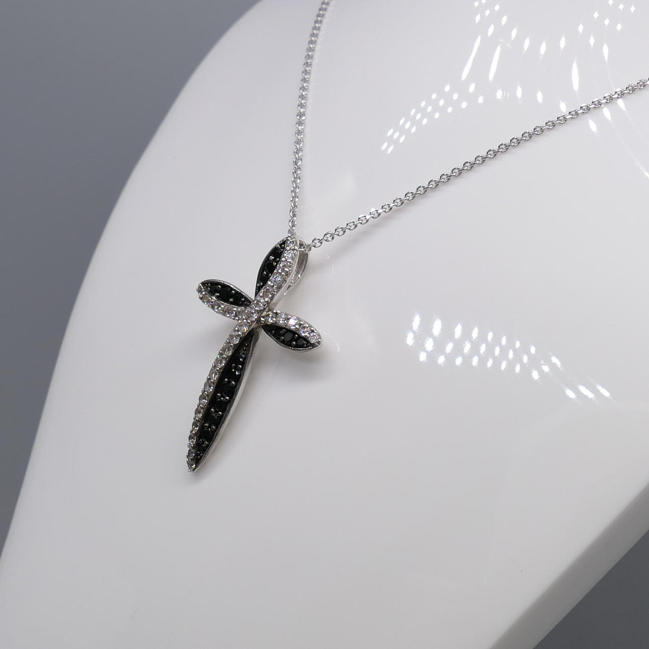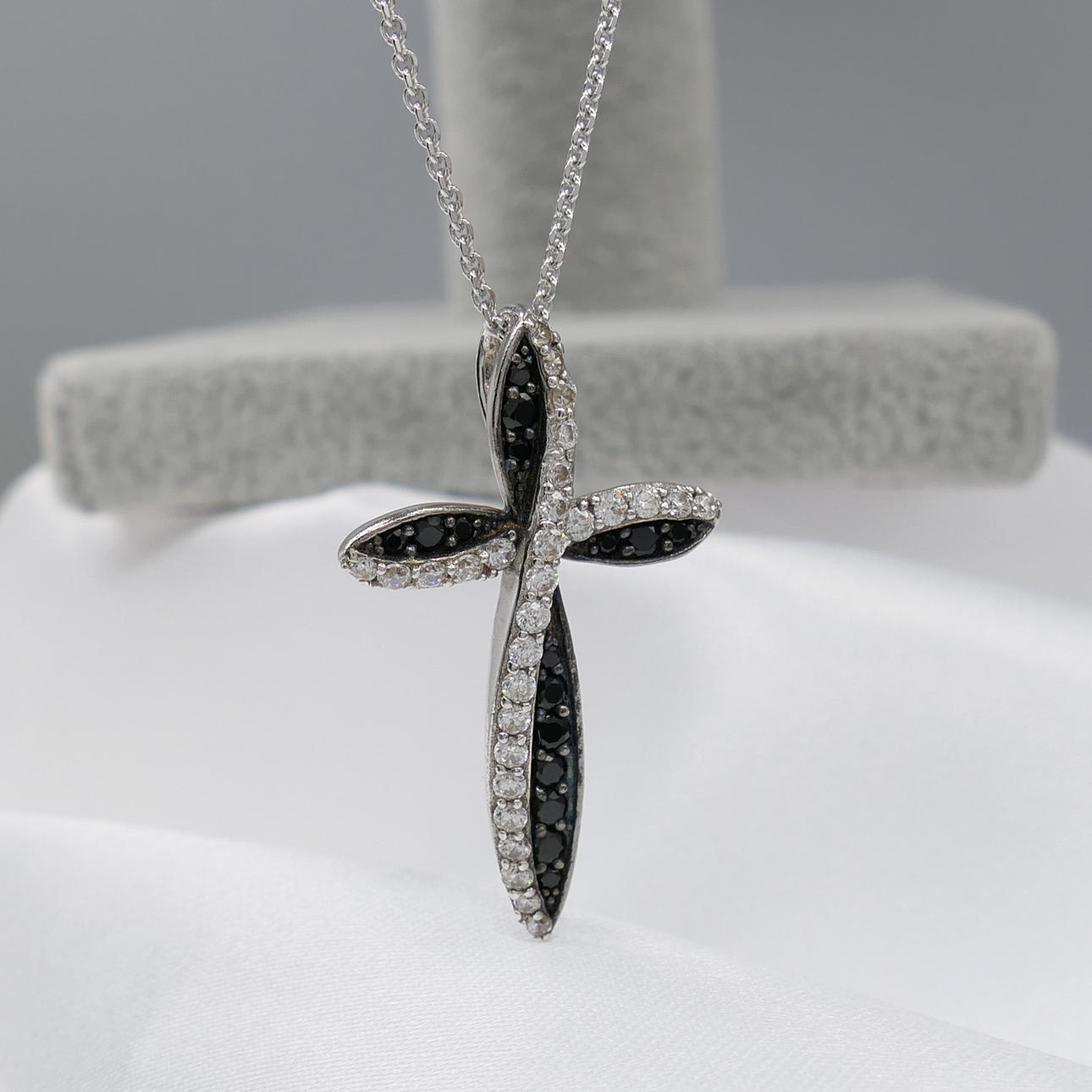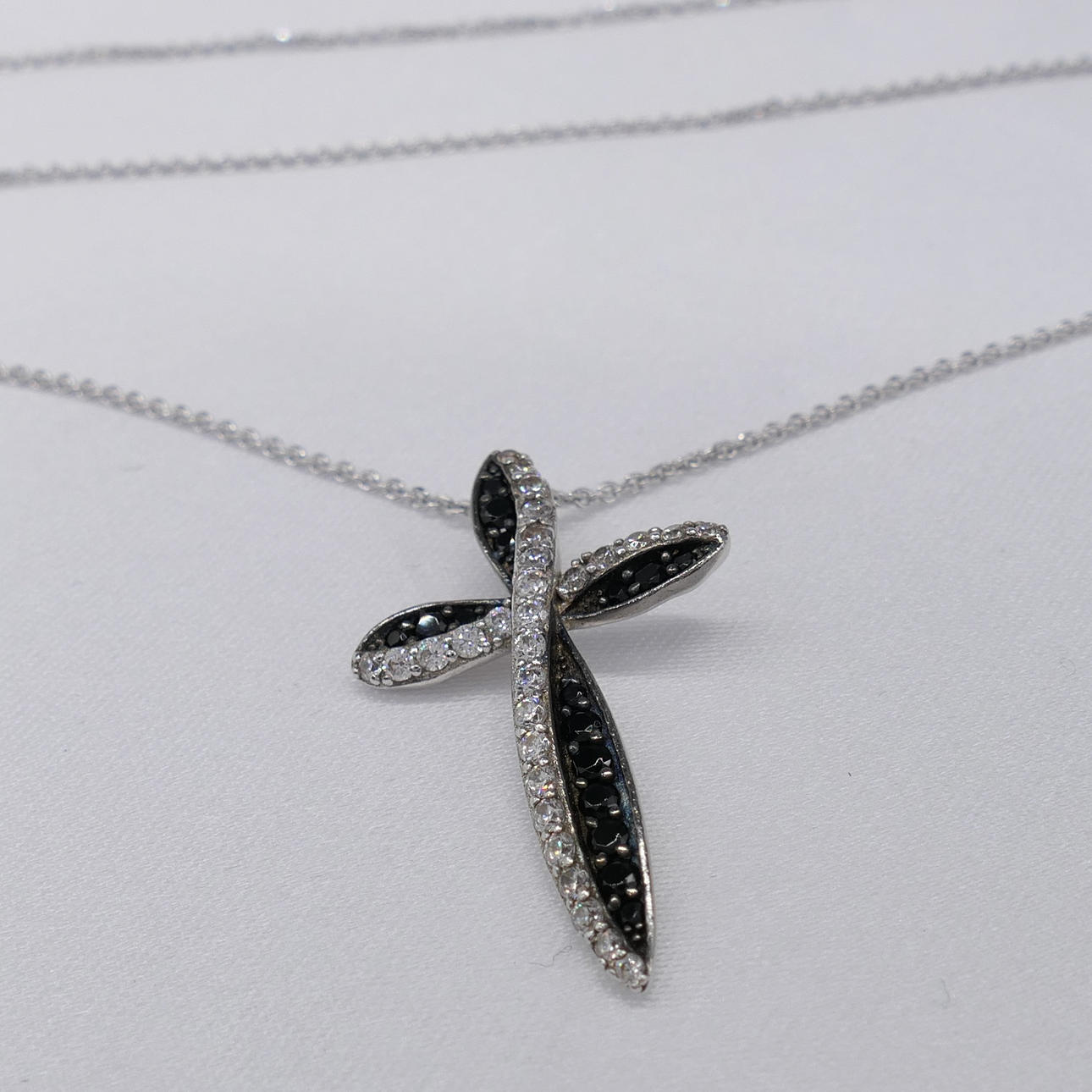 Ett halsband i 925 silver bestående av en kedja och korshänge i tvinnad stil med svarta och vita kubiska zirkoniuperor.