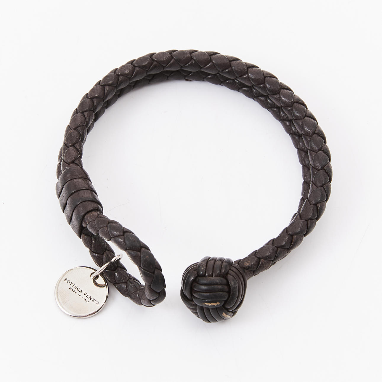 Flätat läder, hänge i vitmetall märkt "Bottega Veneta made in Italy", total längd ca 21cm.