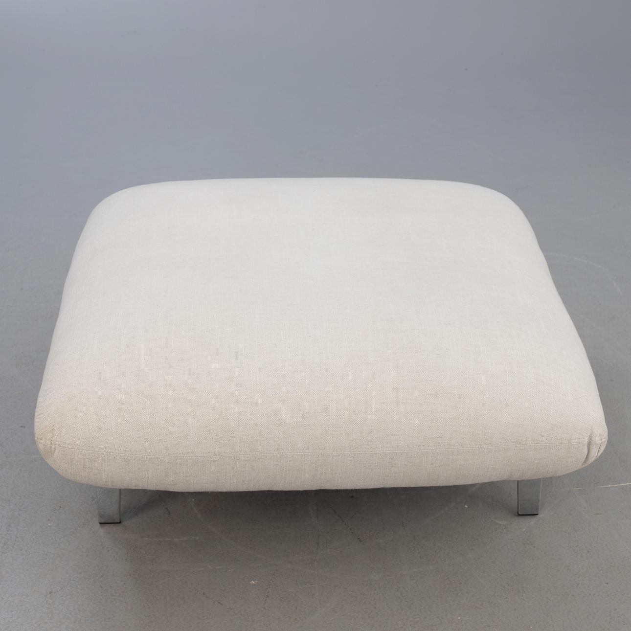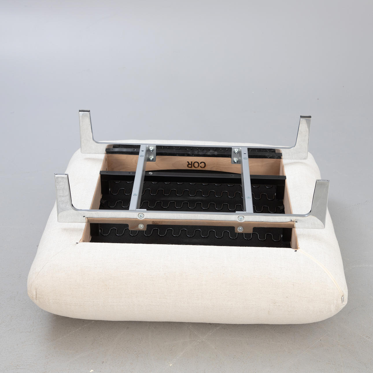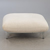 Förkromad platt stålunderkonstruktion, fyrkantig klädsel täckt med ljust tyg. Inskriven med tillverkarens etikett.