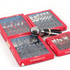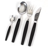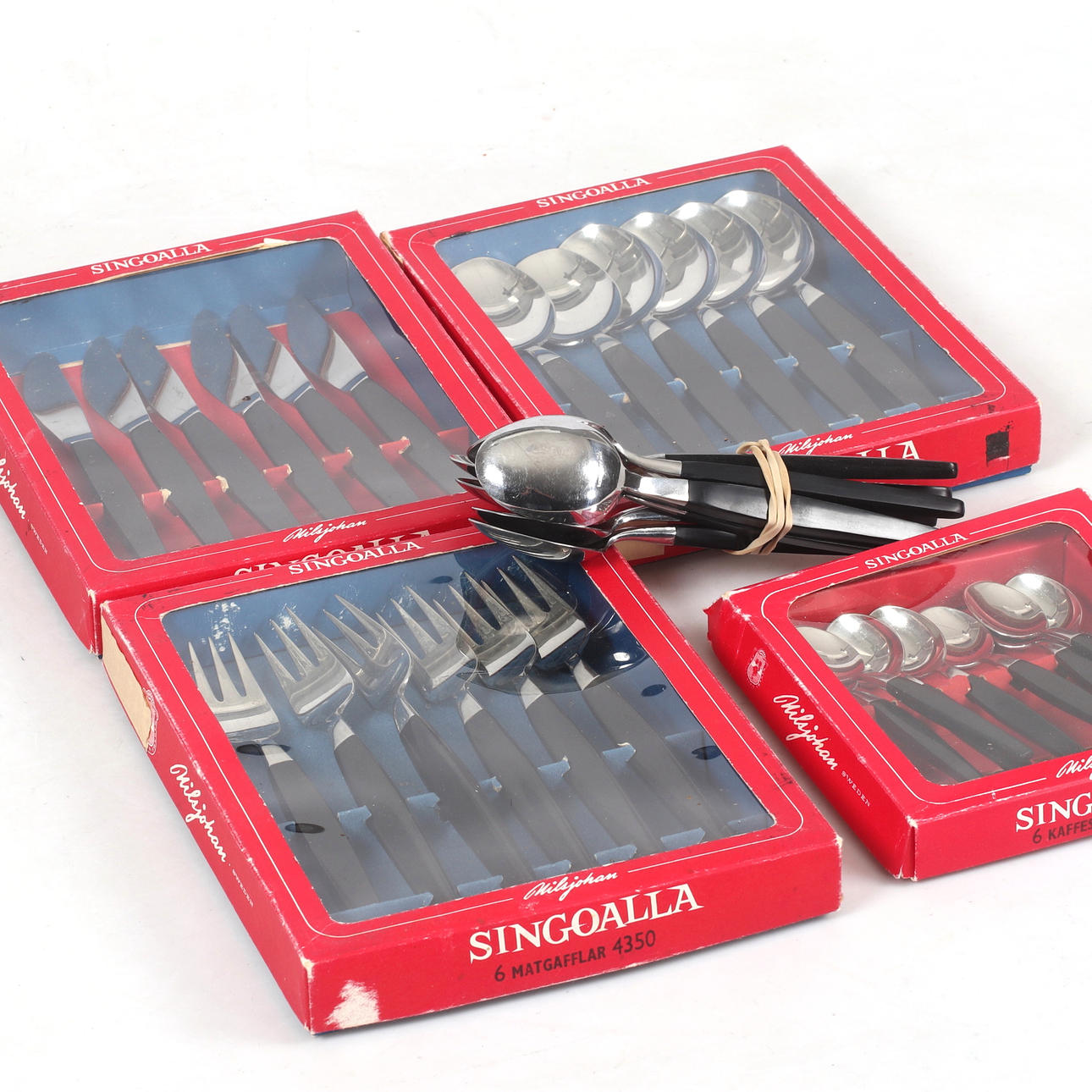 5 matknivar, längd 20 cm. 8 kaffeskedar, längd 12 cm. 6 matskedar, längd 20 cm. 7 dessertskedar, längd 18,5 cm. 6 gafflar, längd 19,5 cm.