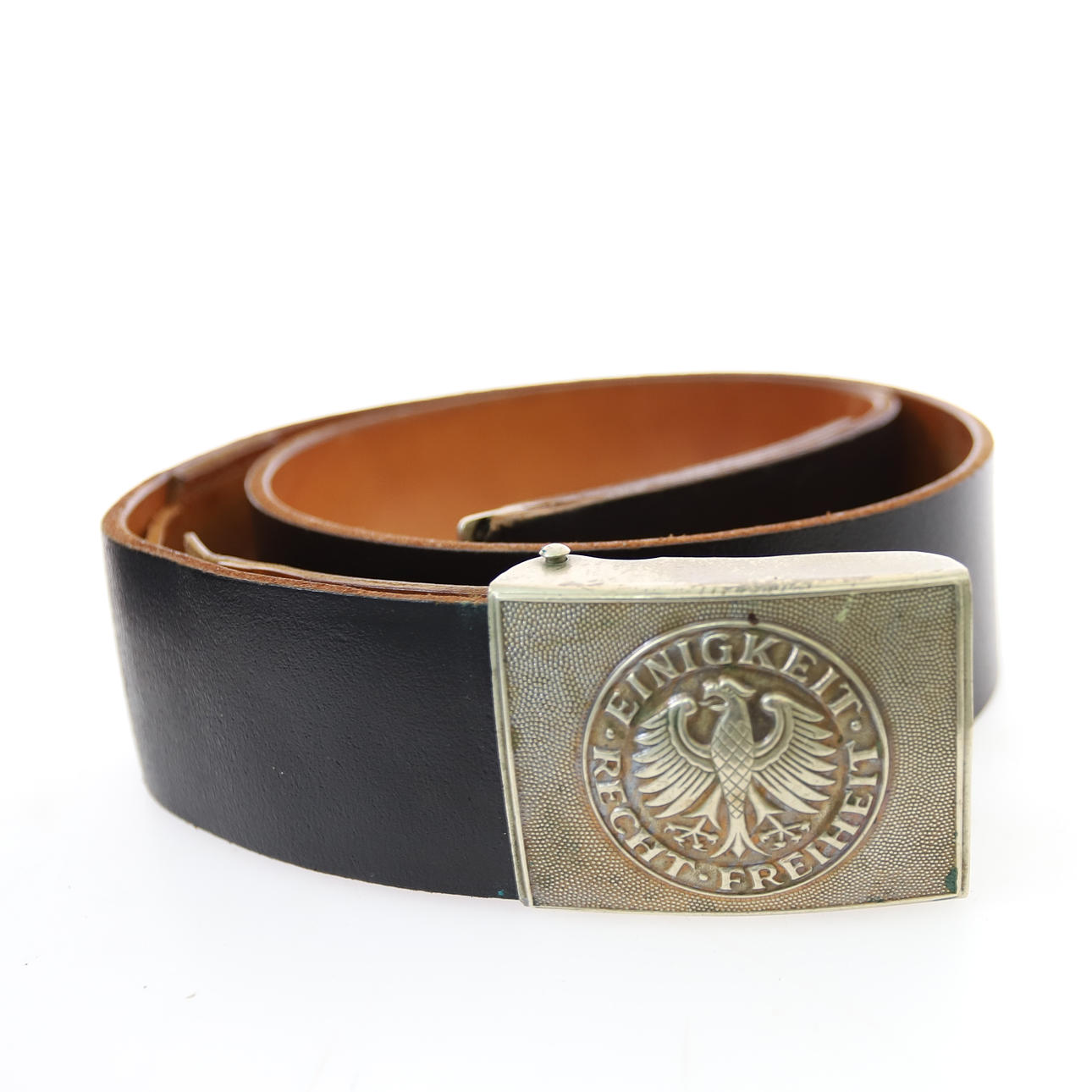 stämplat 'Cotton Oxford Shoemakers Leicester' Ungefär storlek UK9, ett tyskt bälte efter kriget, spännet inskrivet ”EINIGKEIT, RECHT, FREIHEIT” (2).