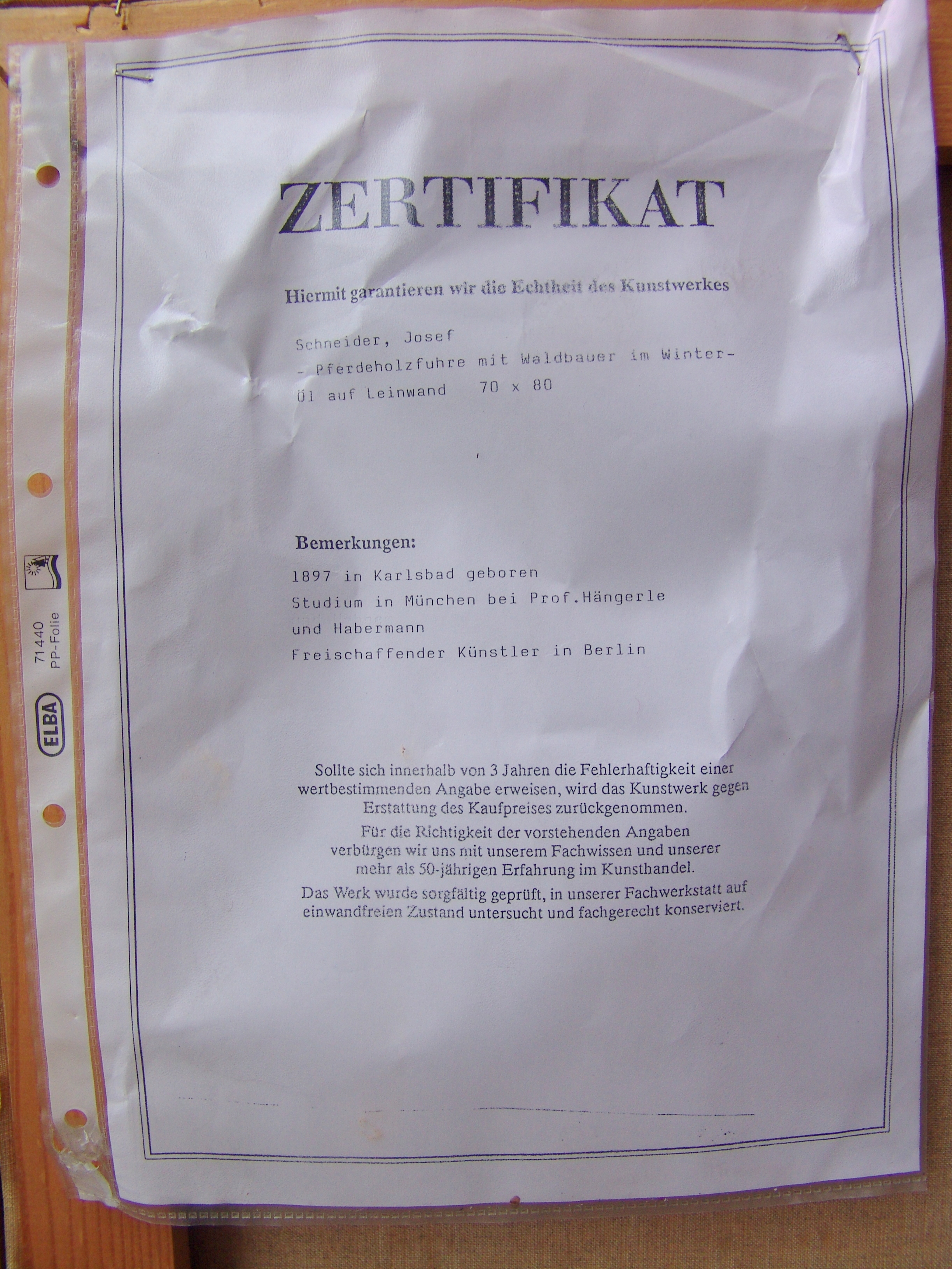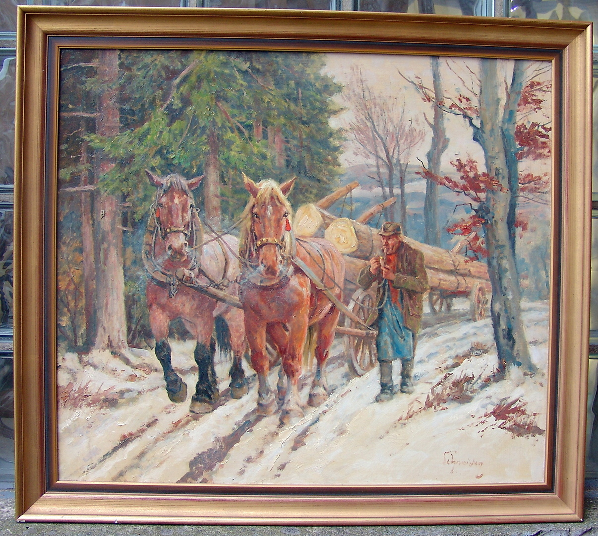 342535. JOSEF SCHNEIDER (1897 KARLSBAD - 1977 BERLIN). ”Backhorse med skogsbonde i ett vintrig landskap”.