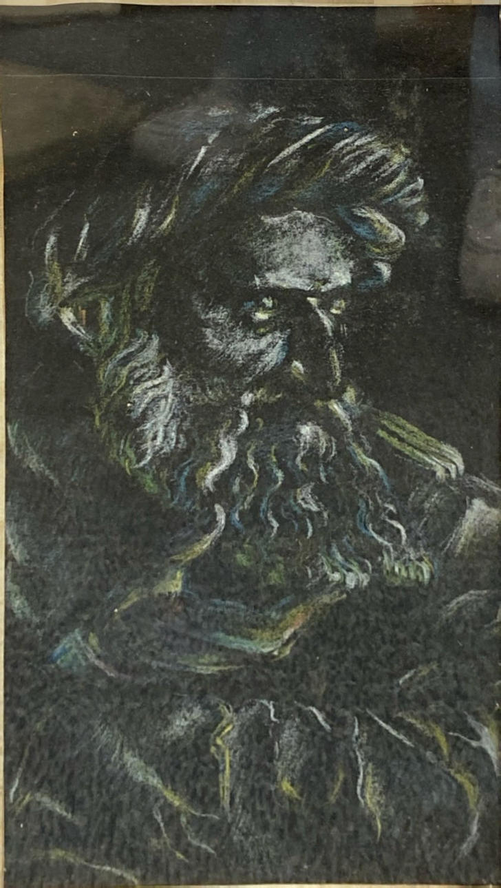 En inramad pastell på svart papper av en skäggig man, ramstorlek 26 x 37cm.