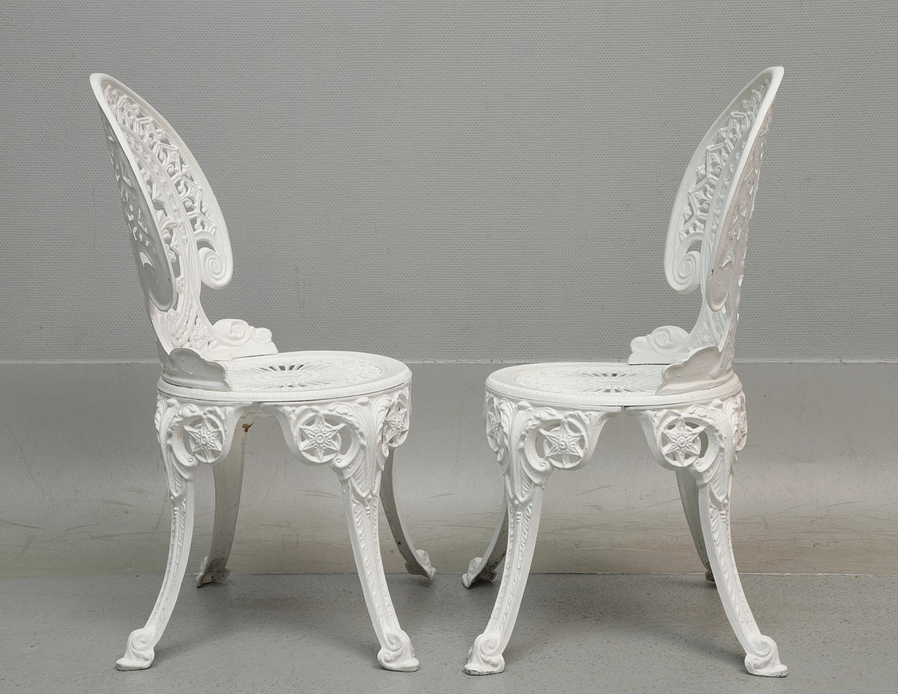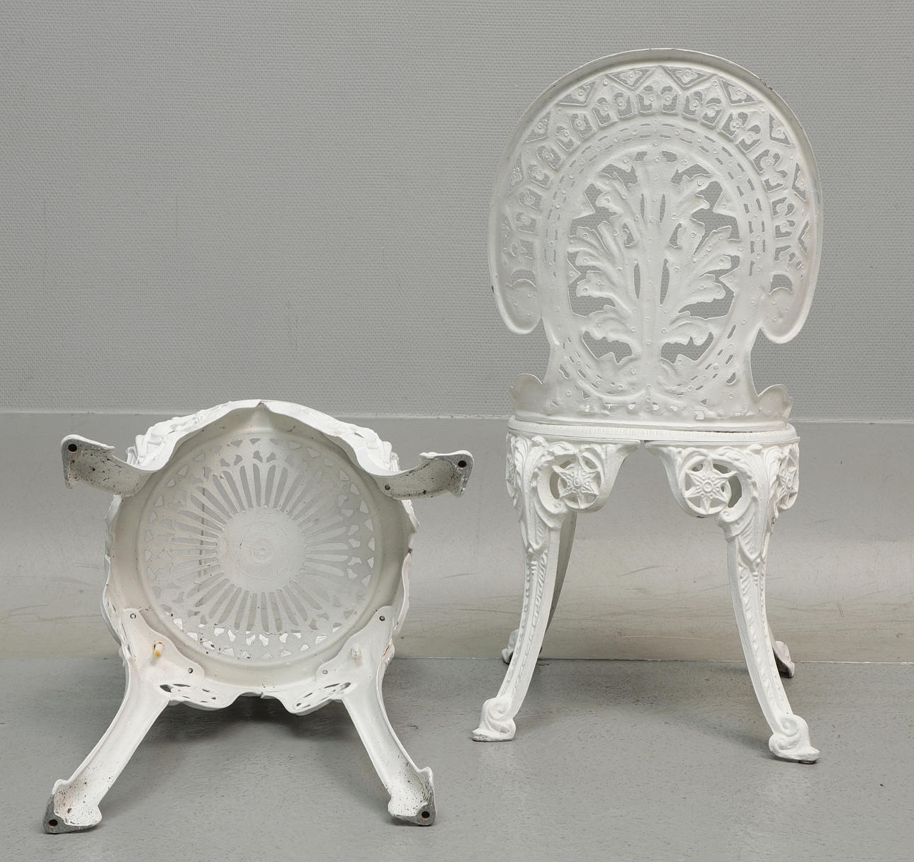 Stolar höjd, ca 85,5 cm. Bredd, ca 38 cm. Bord höjd, ca 70 cm. Diameter, ca 80 cm.