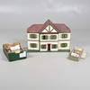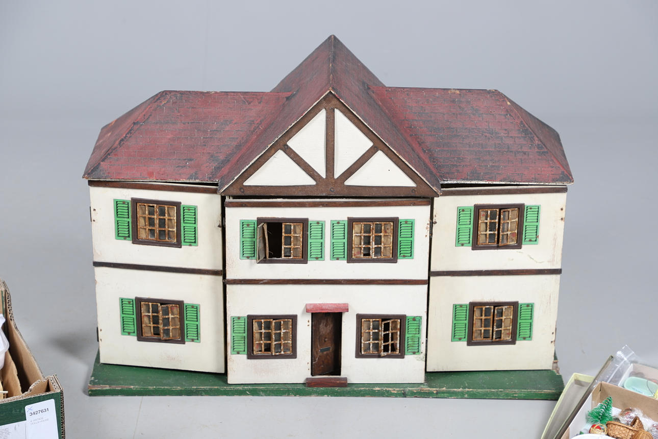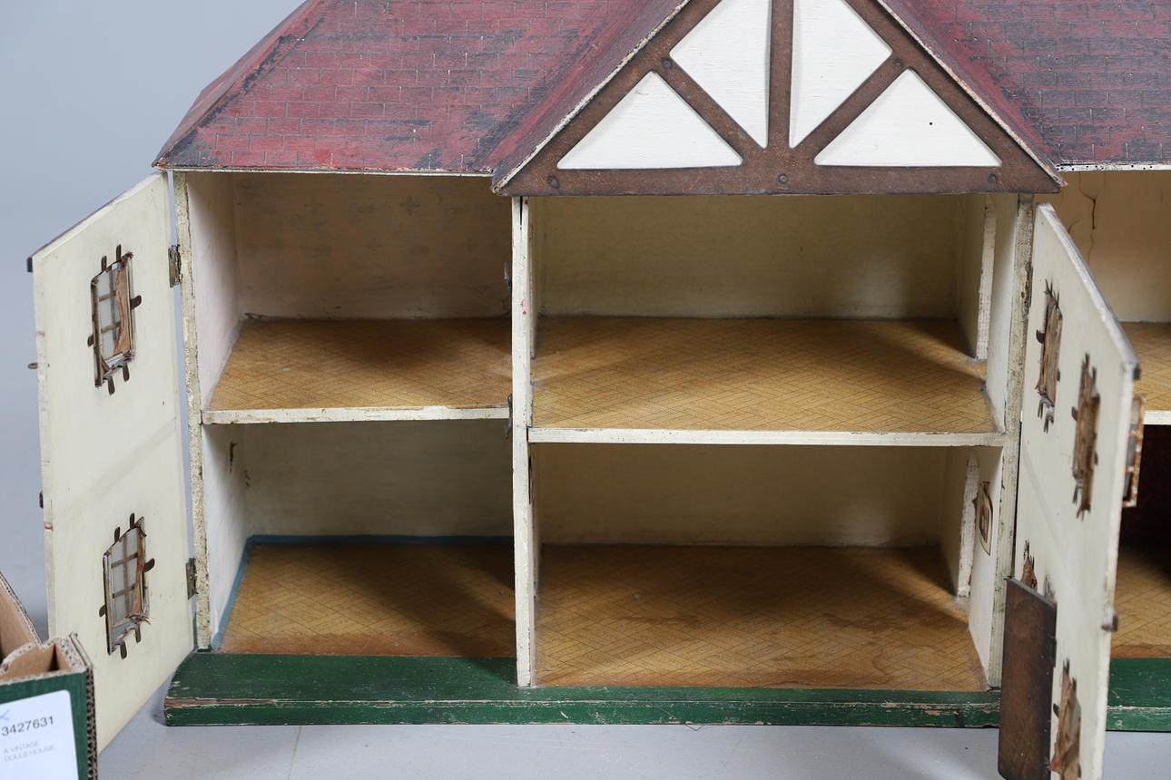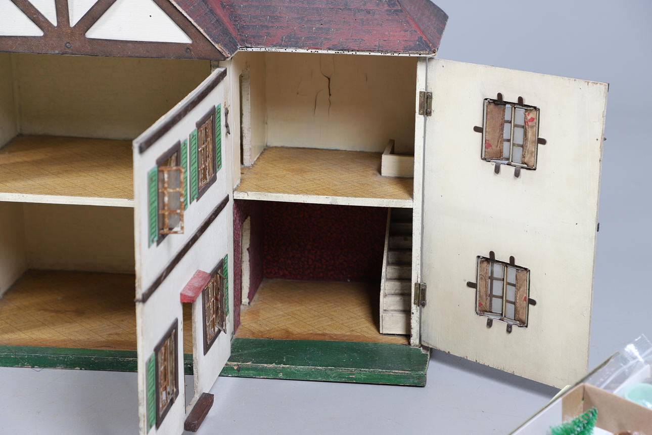 Design från tidigt 1900-tal, med tre öppningsbara främre sektioner som avslöjar 3 rum på var och en av de två våningarna. Tillsammans med en mängd dockor husmöbler. Höjd 53cm x Längd 77.5cm x Djup 27cm.