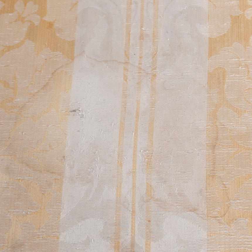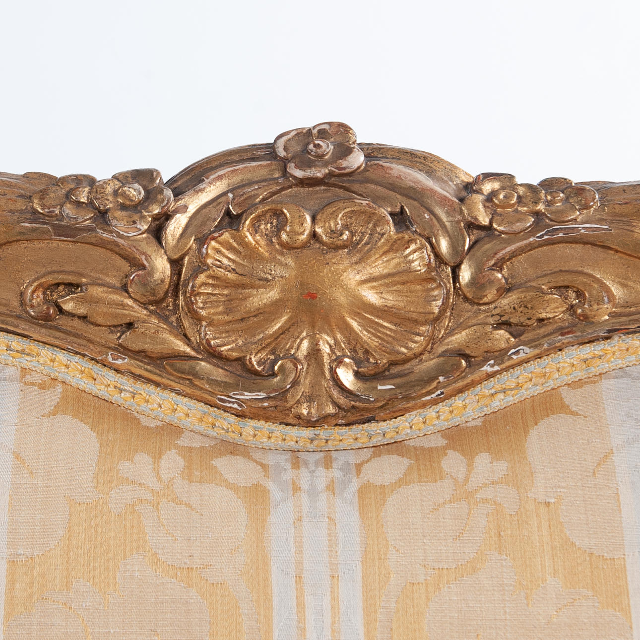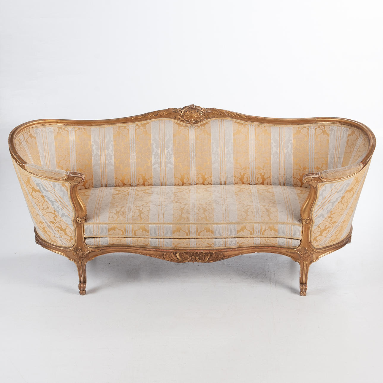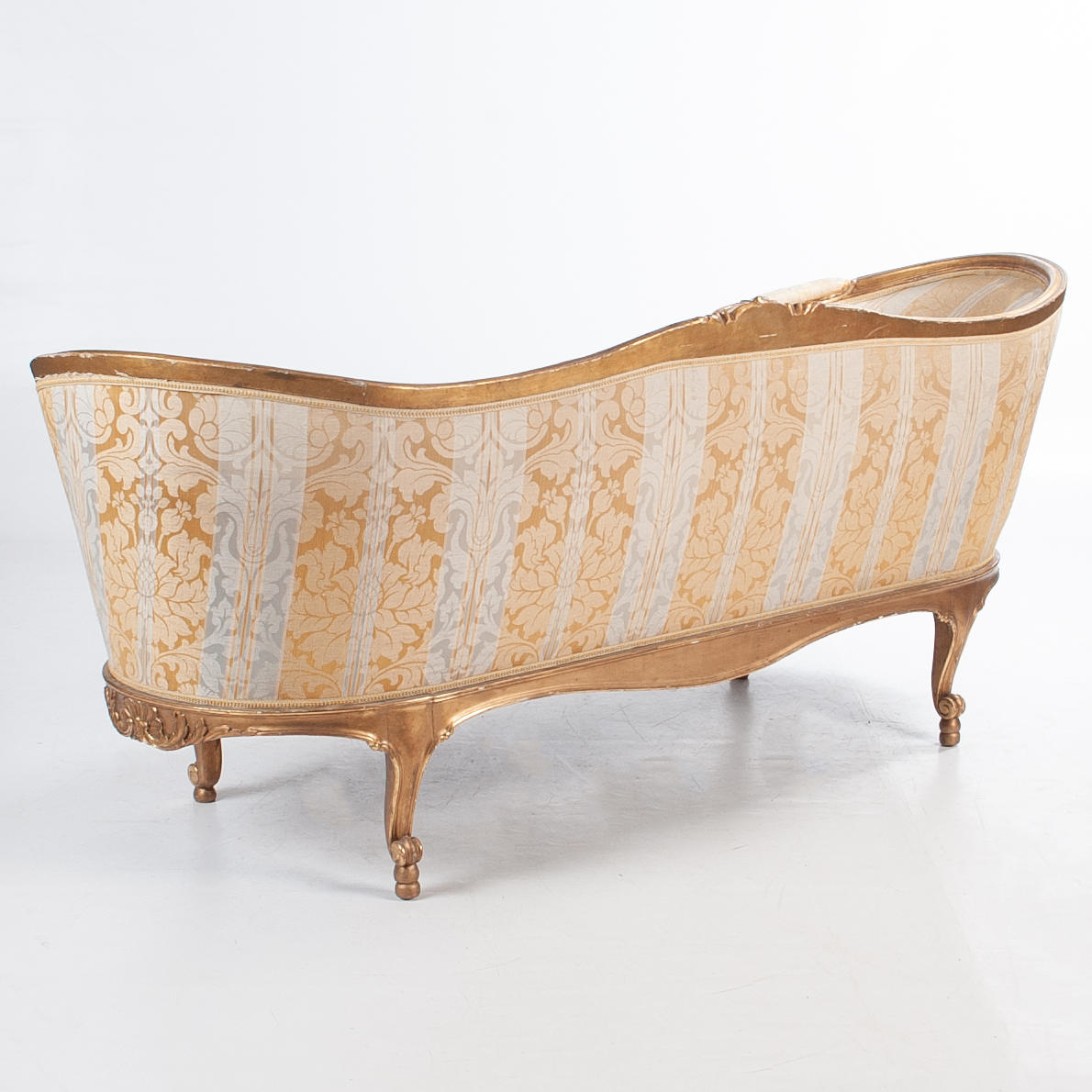 Längd 187cm. Djup 70cm. Rygghöjd 83cm. Sitthöjd 45cm. Stoppning i tagel, förgyllt trä.