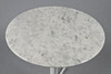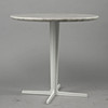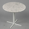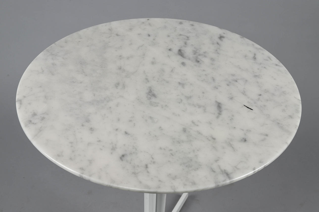 Sidobord med rund marmorskiva och vitlackerad metallunderrede.