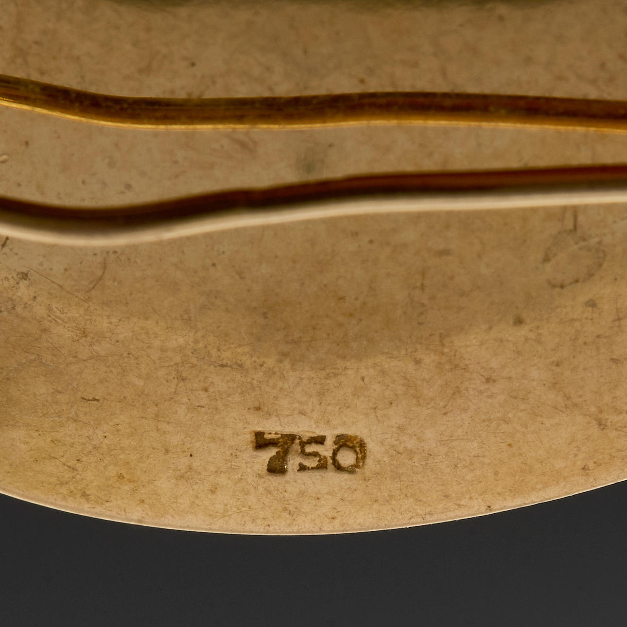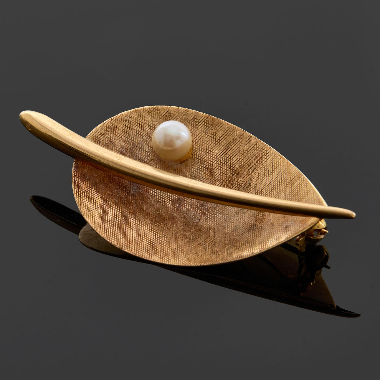3436100. BROSCH, 18k, i form av blad med pärla.