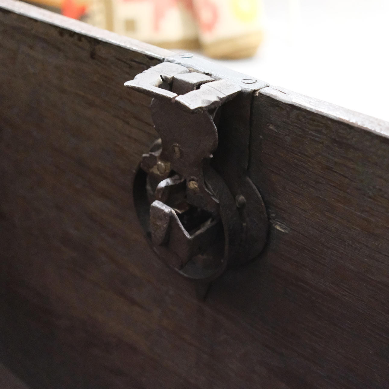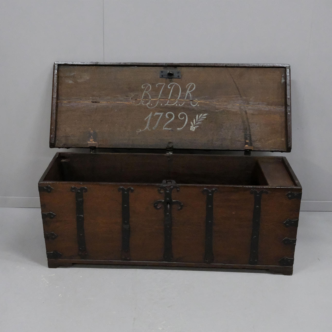 Järnbeslag. Lockets insida med initialer B.J.D.R samt datering 1729. Fack. Längd: ca 139 cm. Höjd: ca 53 cm. Bredd: ca 53 cm.