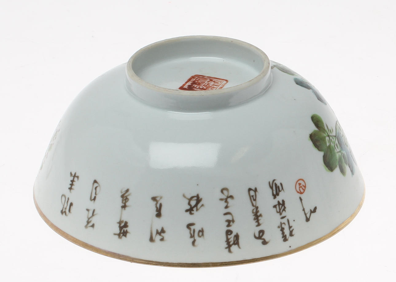 Dekor i polykroma färger av bla fågel. Diameter 18,5 cm.
