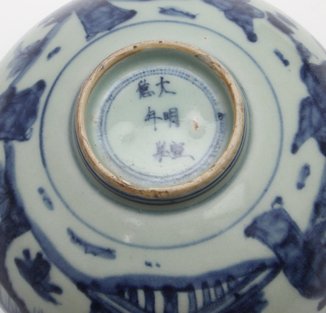 Dekor av figurscen i underglasyrblått. Diam 18 cm.