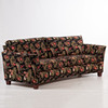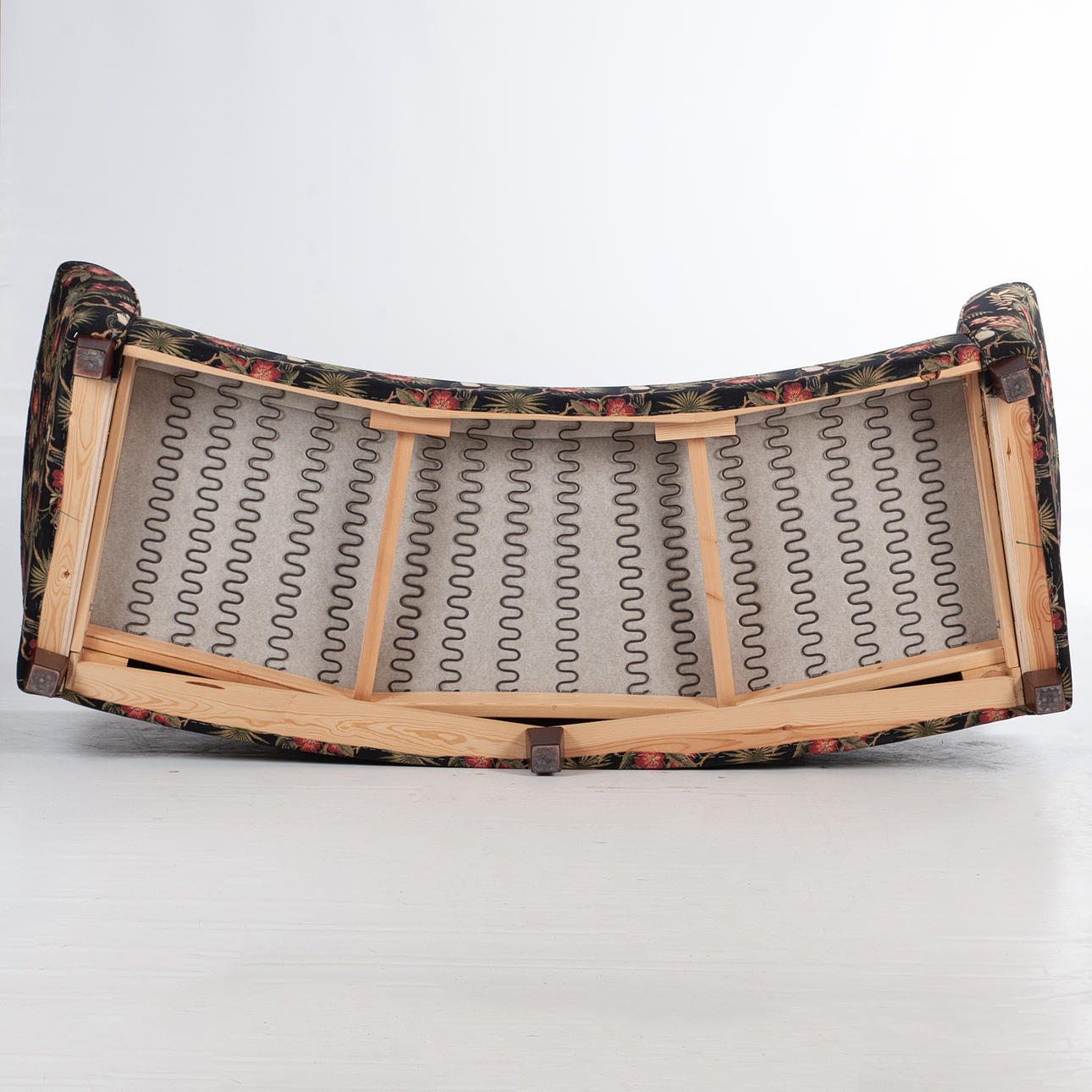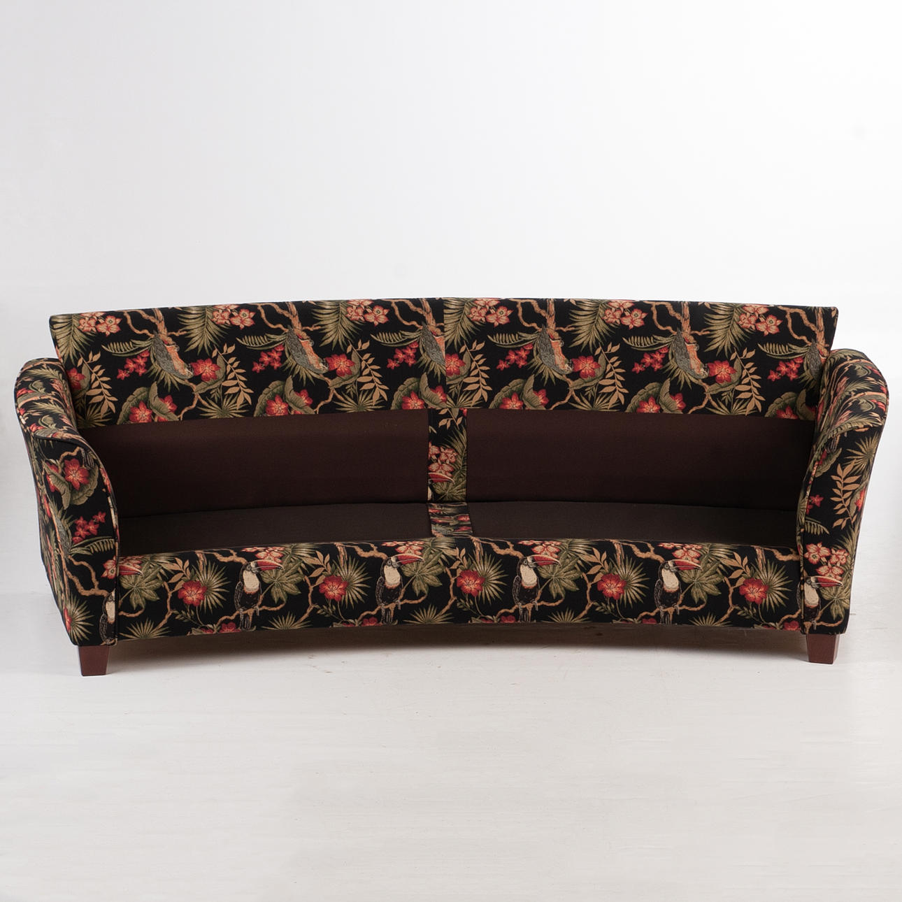 Svängd modell. Flerfärgad textilklädsel "Ara" på svart botten. Fast stoppad rygg och sits. Lösa kallskum/dunplymåer i rygg och sits
