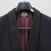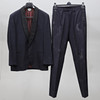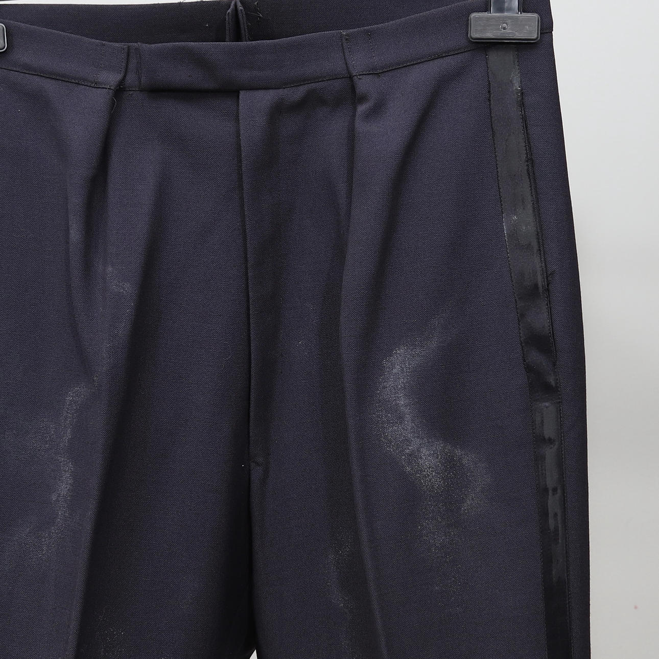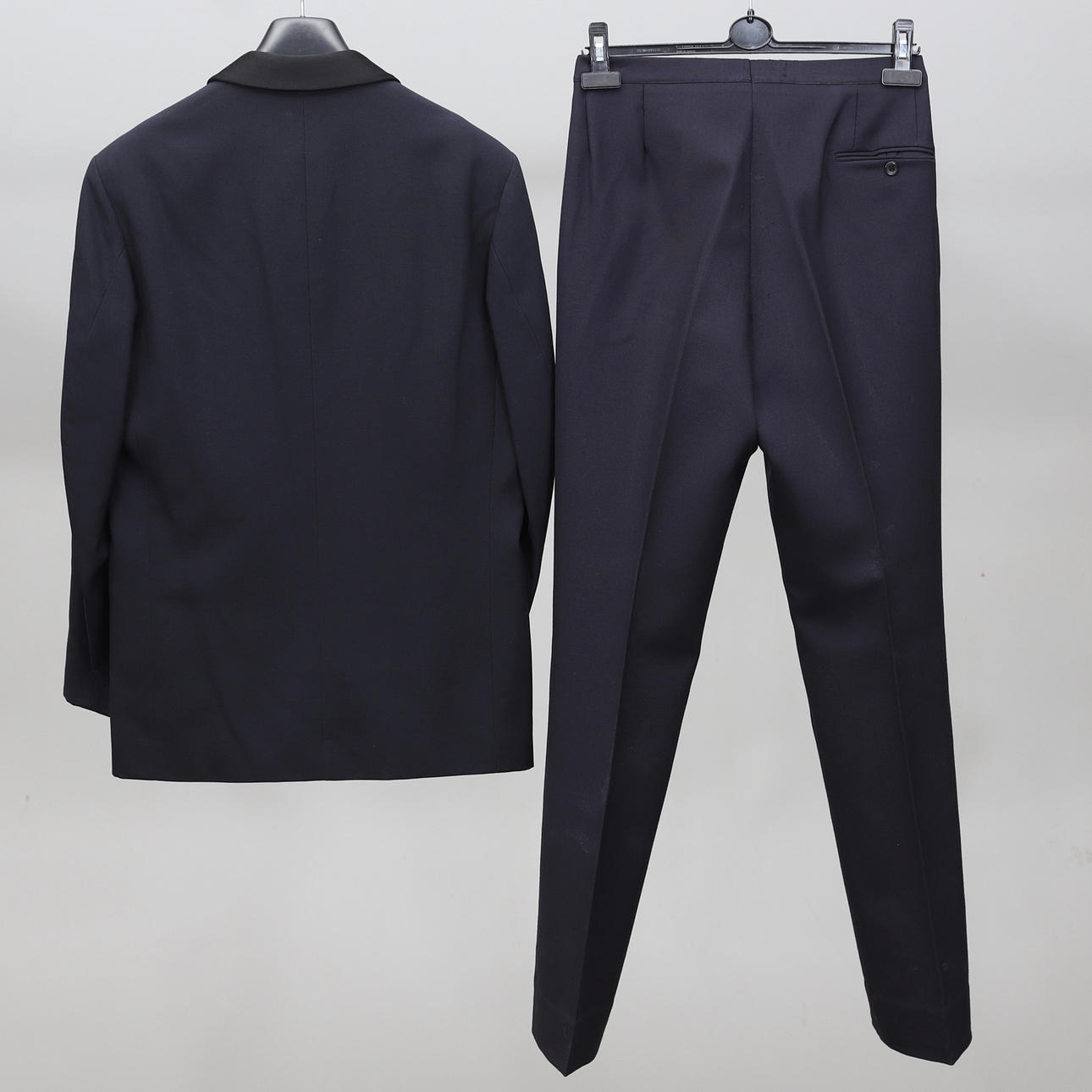 Kavaj, mått armhåla till armhåla ca 54 cm. Längd ca 75 cm. Byxor, midjemått ca 36 cm. Inre benlängd ca 79 cm.