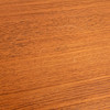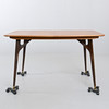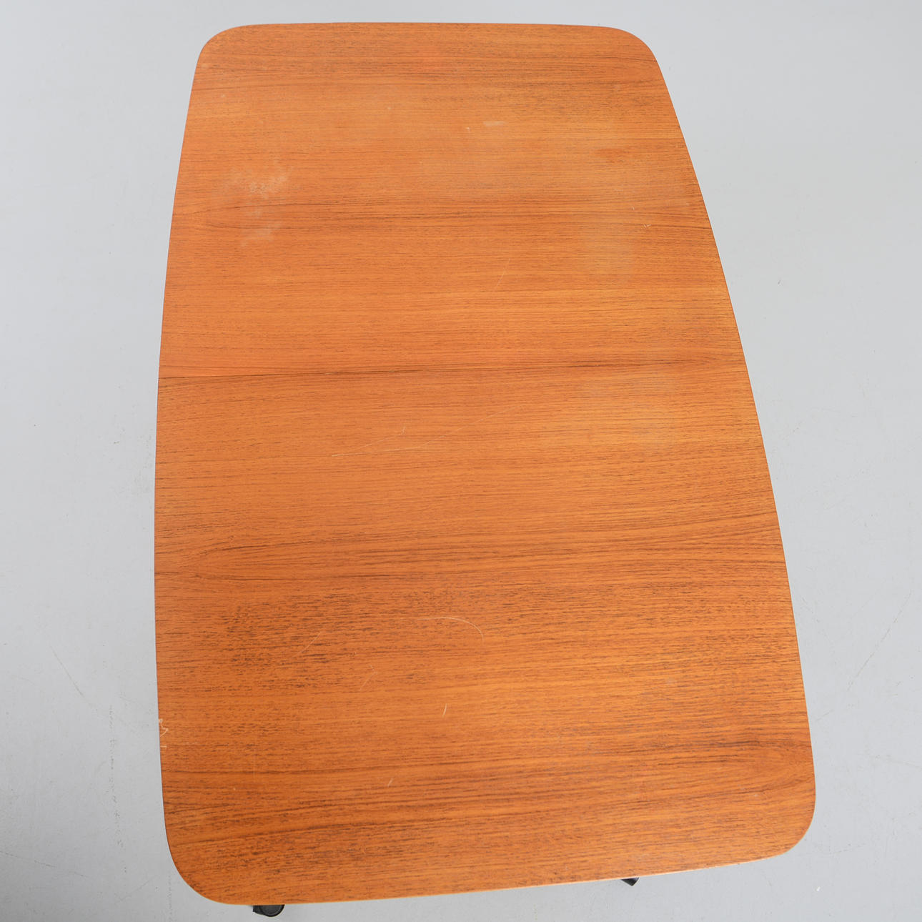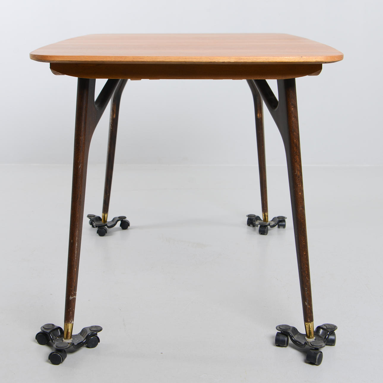 Skiva fanerad i teak, ben av betsad bok med mässingsskodda fotavslut. Längd 127,5, bredd 79, höjd 72 cm.
