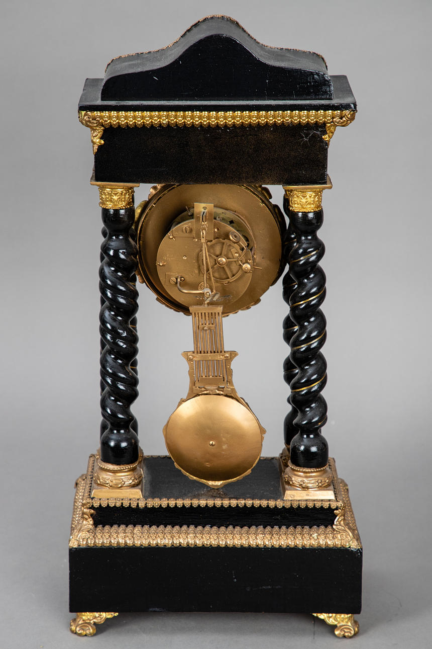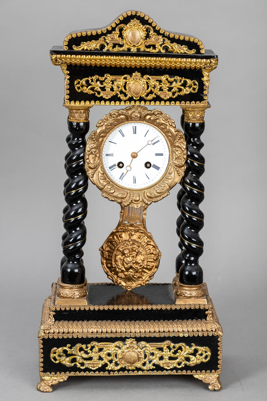 eboniserat trä/mässing. Den rektangulära, enstegade basen på fyra svängda fötter. Motsvarande pediment med krökt krönning på fyra vridna pelare. Rikt dekorerad front med olika mässingstillämpningar. Rund emalj urtavla med romerska index. Pendel med nyckellyft och halvtimmes slag. Bell saknas. HxBxD: ca. 52 x 26 x 15 cm.