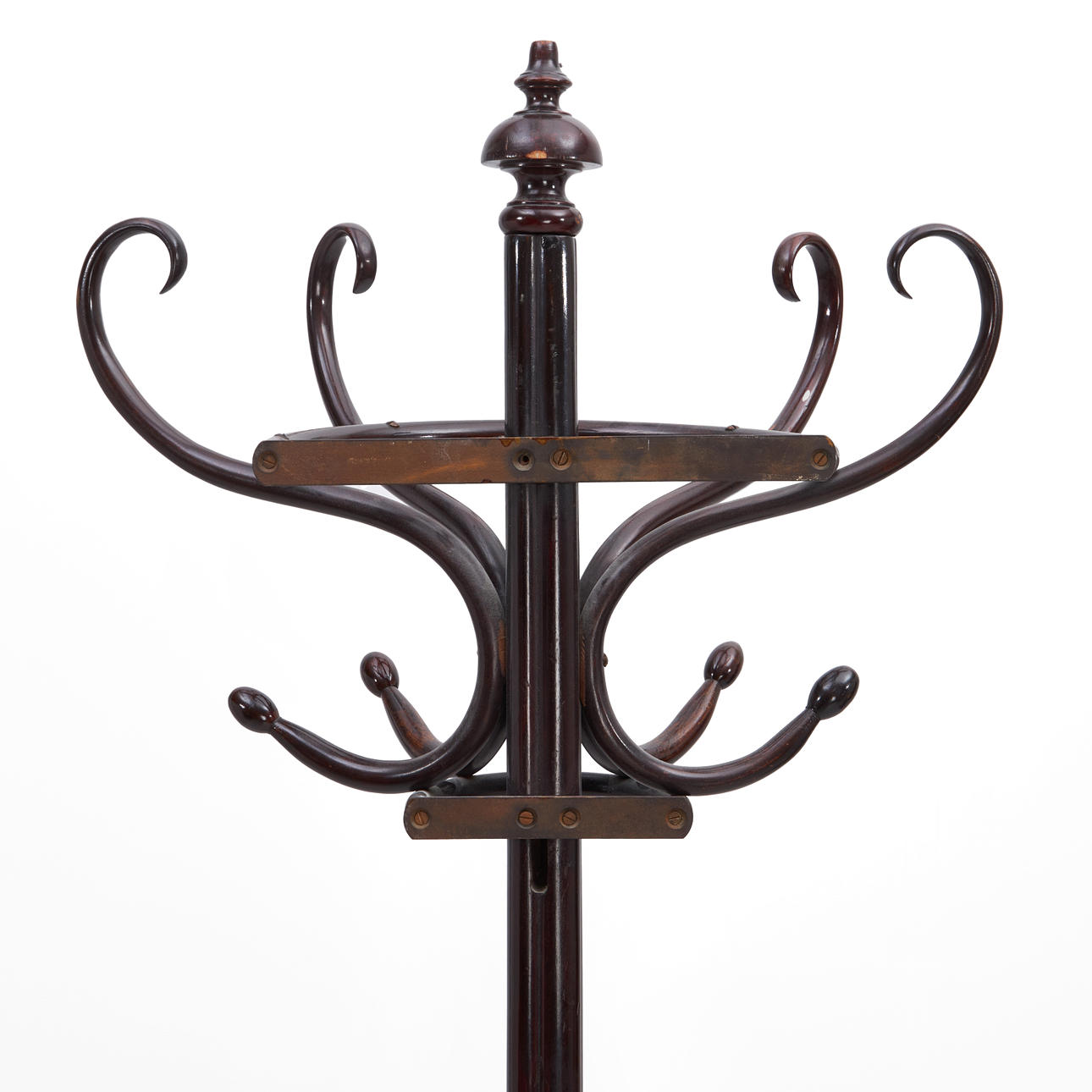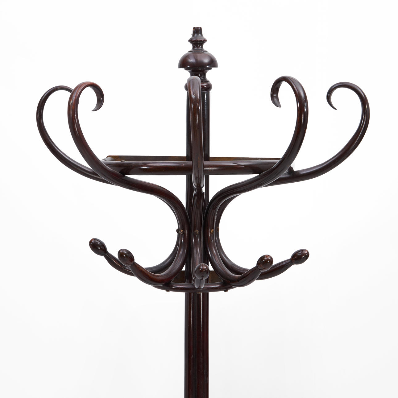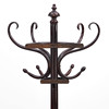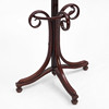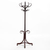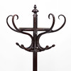 Tre ben med fästen i halvcirklar för att ställas mot vägg. Fyra krokar samt paraplyställ. Höjd ca 200 cm.