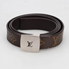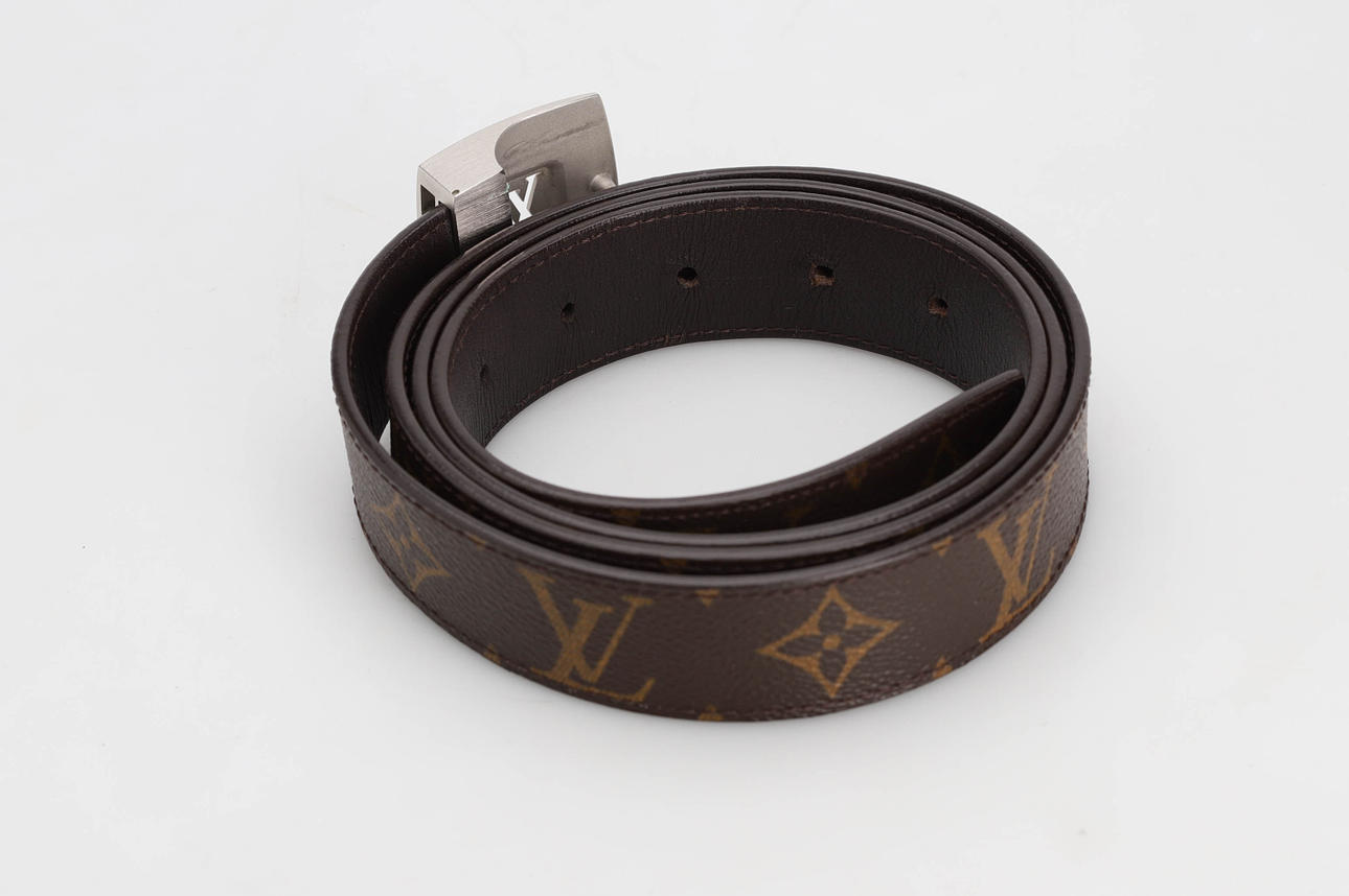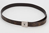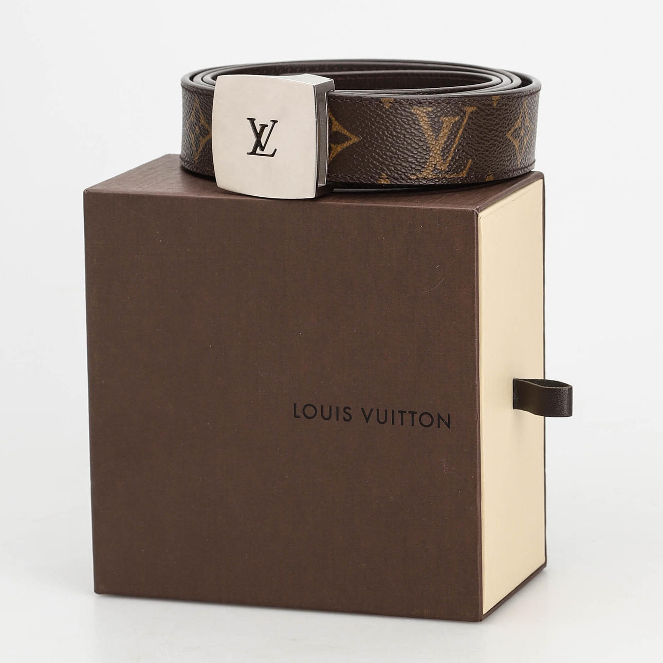 Skärp i monogrammönstrad läder med spänne i borstad metall. Längd ca 115 cm. Bredd ca 3 cm. I originalbox med måtten ca 14x14x7 cm.