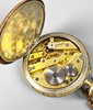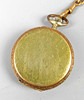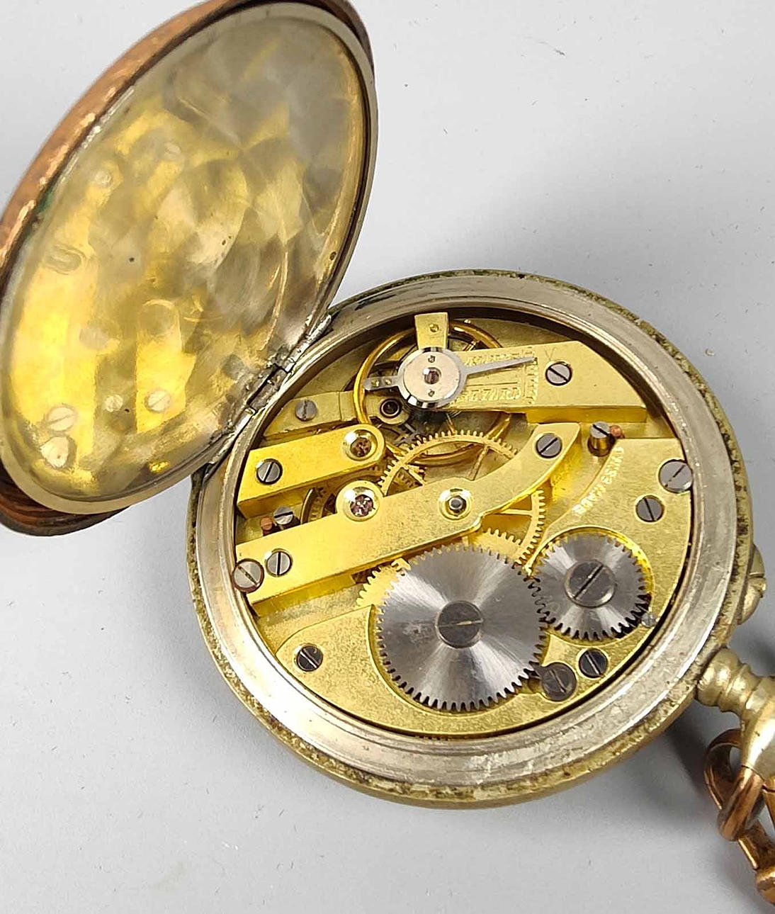Klockfodral med delvis blommig relief, märkt Franz Werndle Pforzheim, vit urtavla med svarta och blå arabiska siffror samt guldfärgade minutprickar och dekorativa visare, liten sekund klockan 6, *Swiss Made* manuellt urverk, startar inte, diameter ca. 43 mm med skalad gulddubbel klockkedja, längd med karbinhake och stor fjäderring ca. 26 cm.