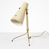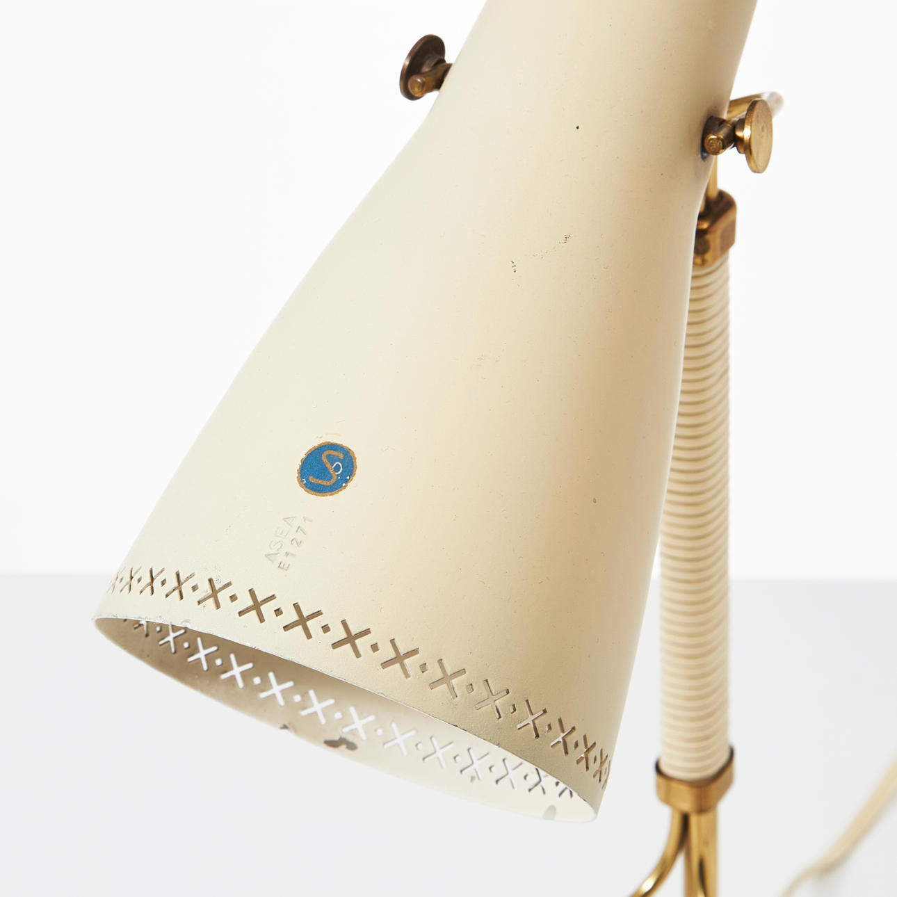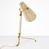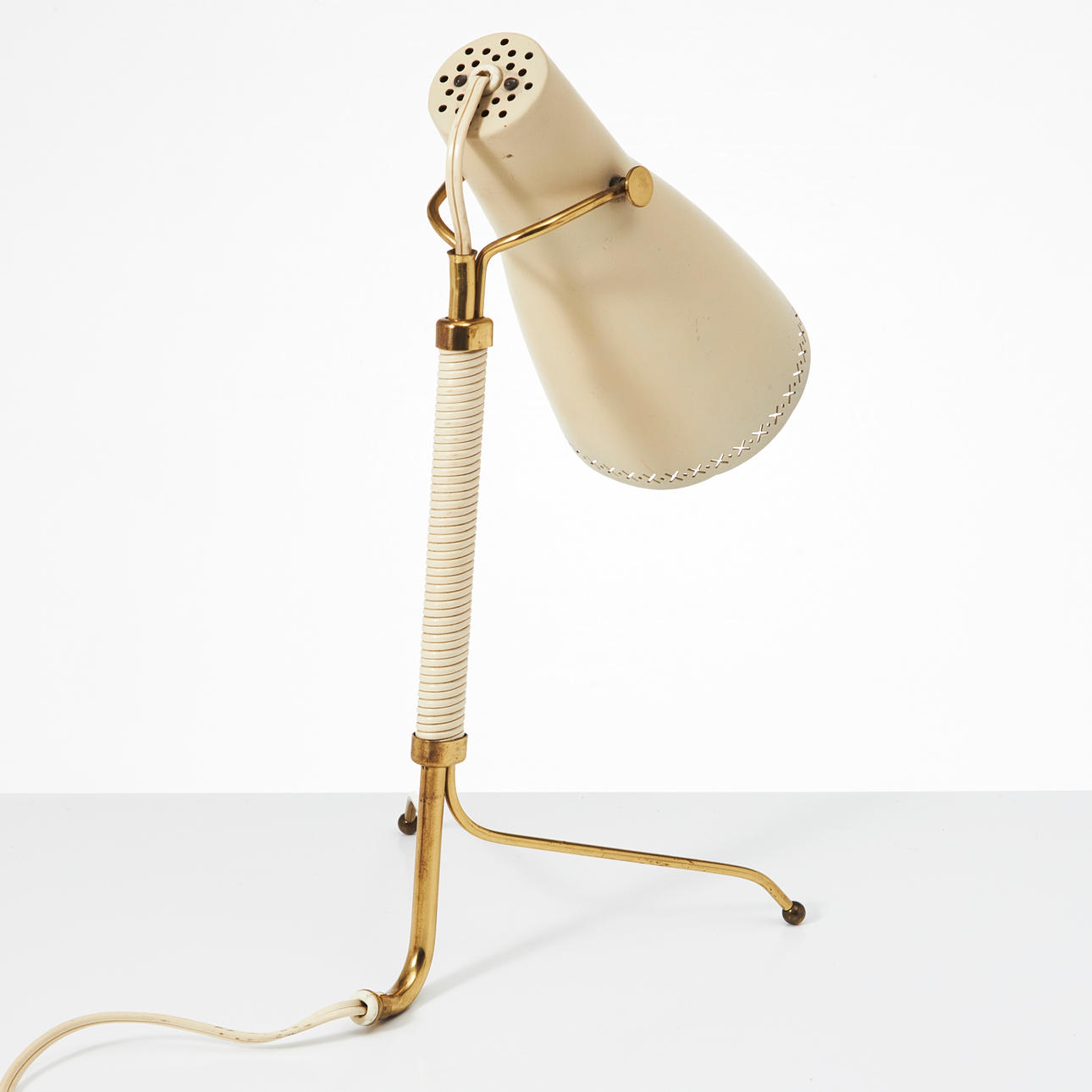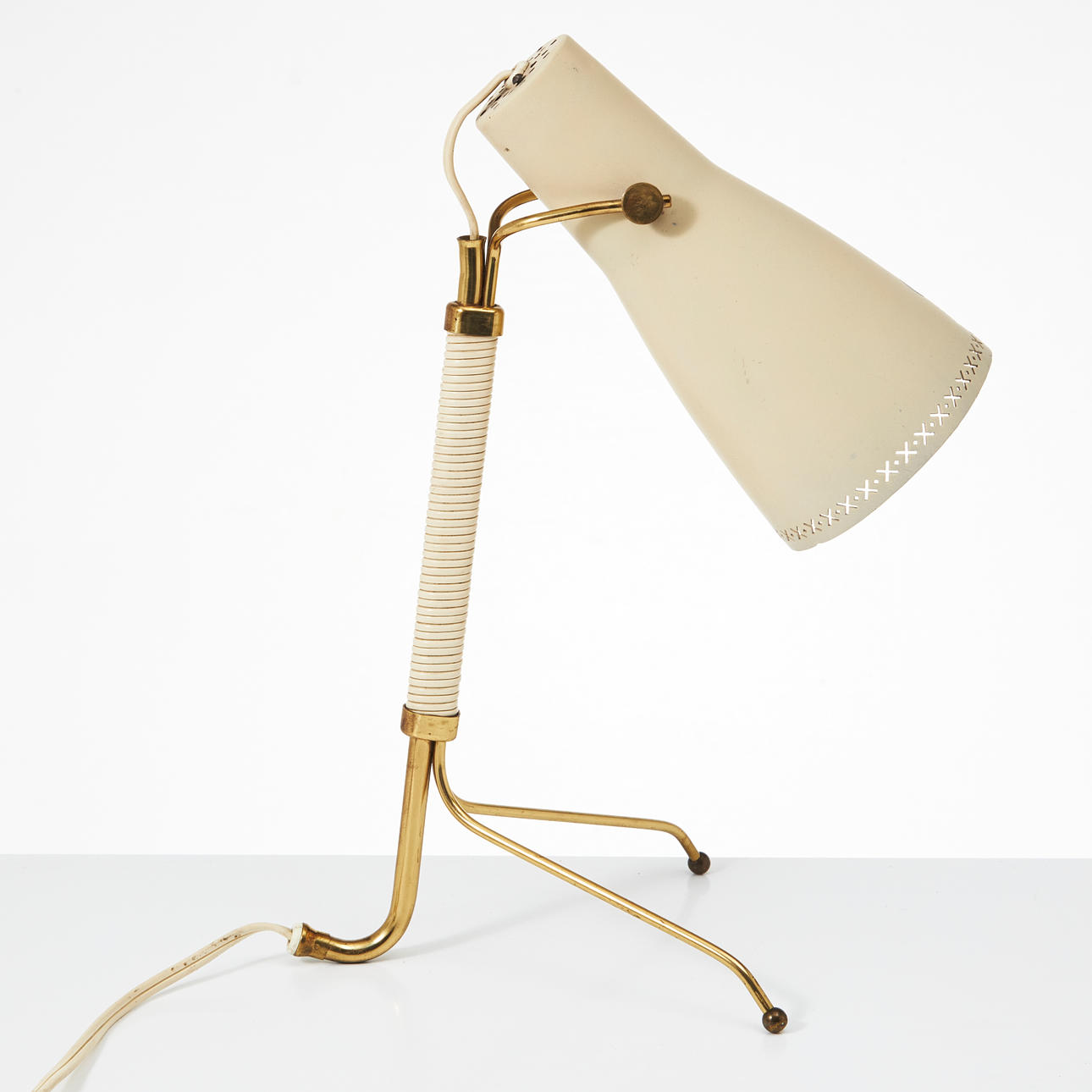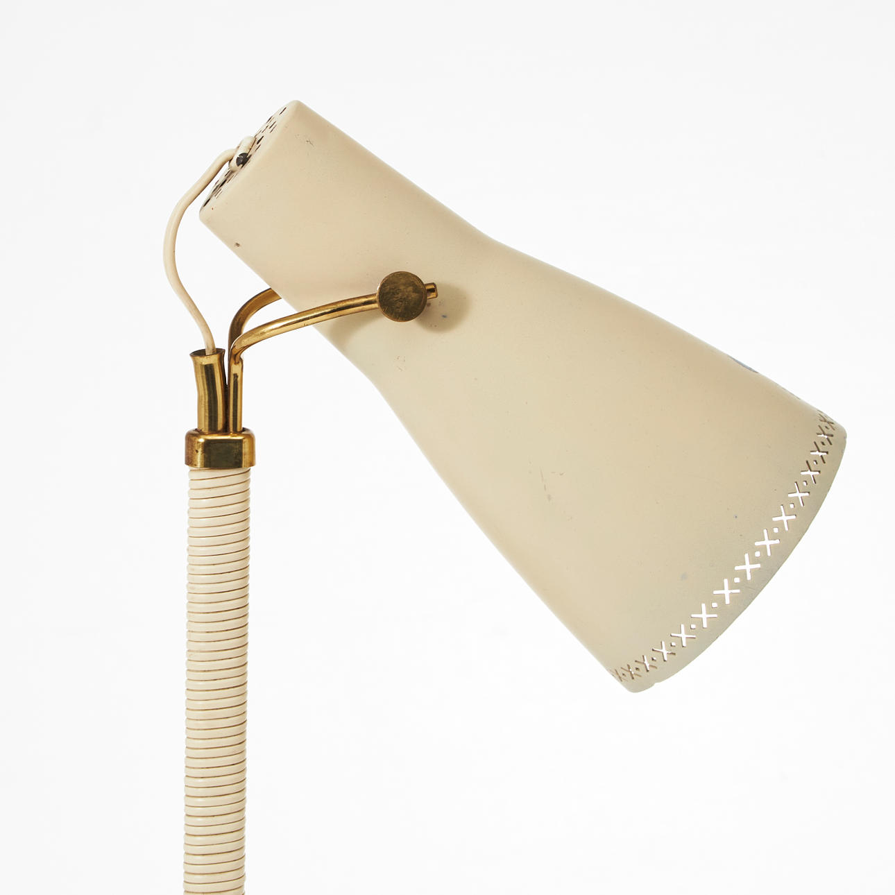 Ställbar lackerad skärm, lindad stam av mässing på tre ben, höjd ca 39 cm.