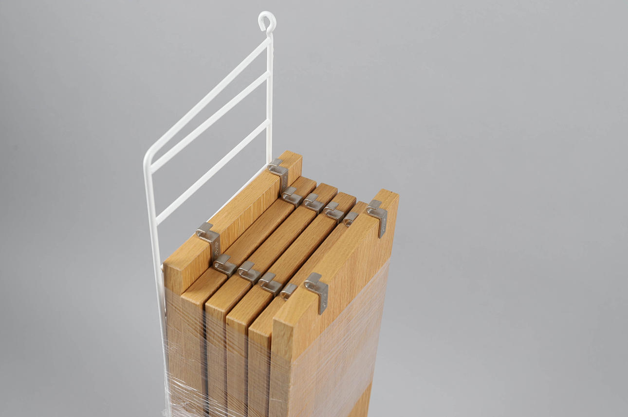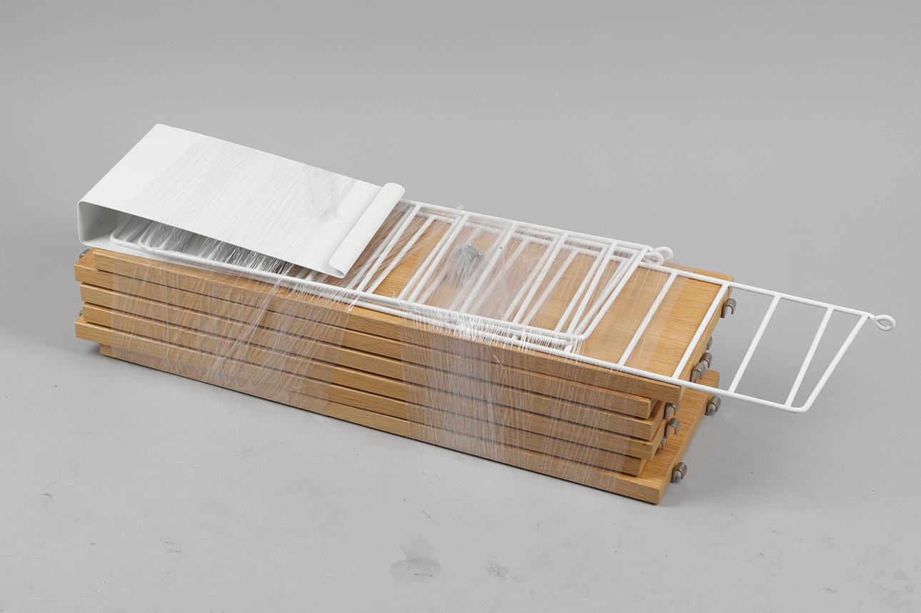 6 ekfanerade hyllplan, vita grindar. Längd 60, höjd 77 cm.