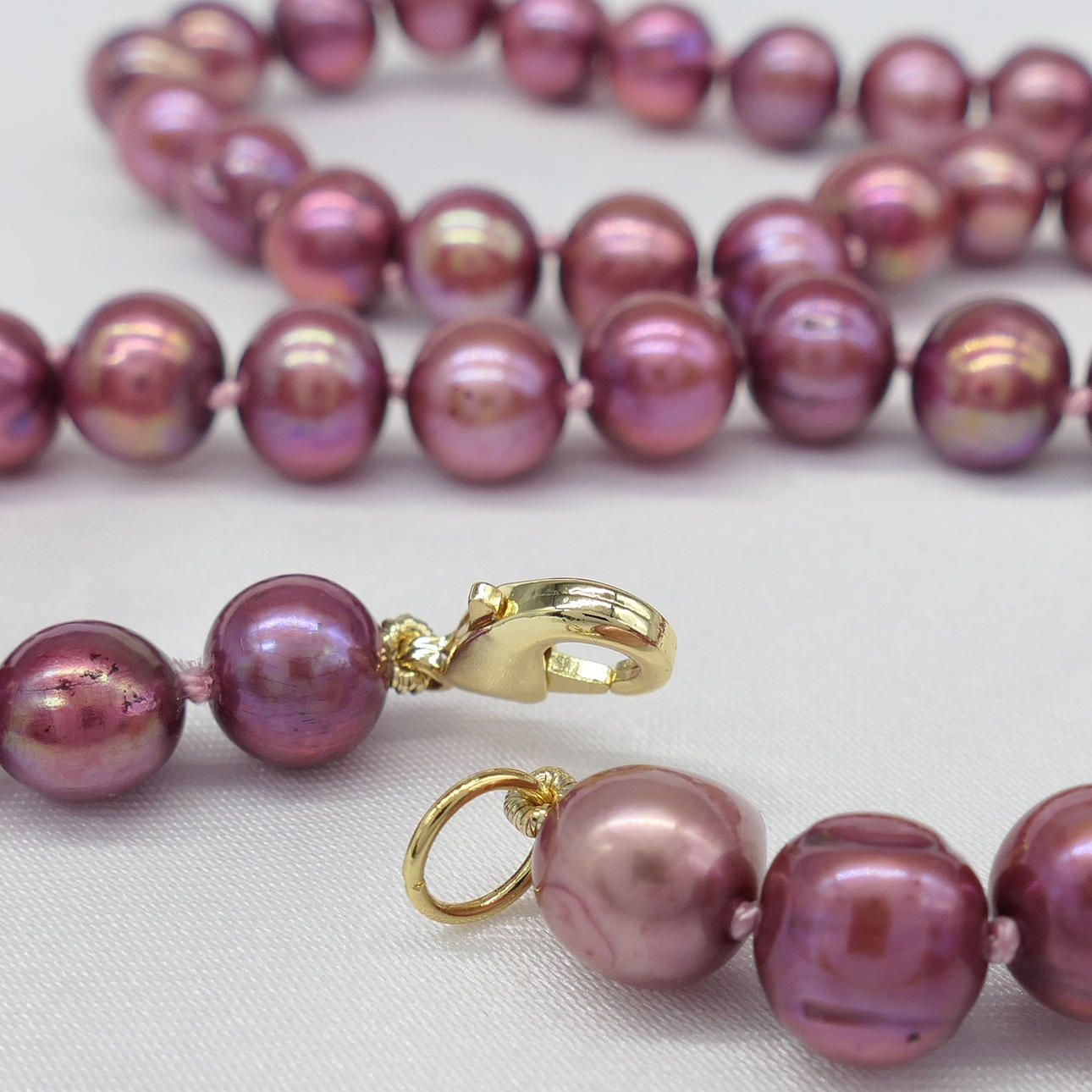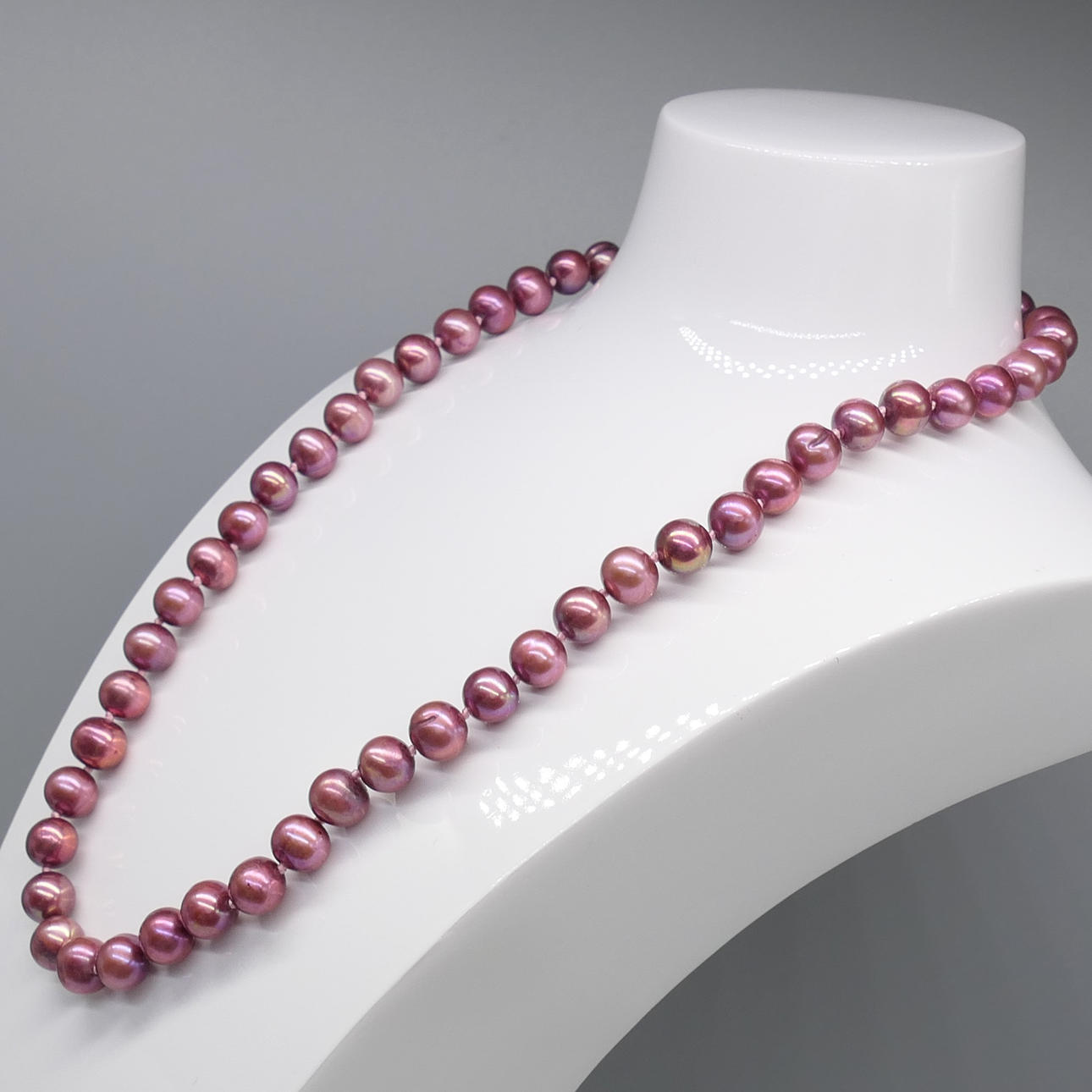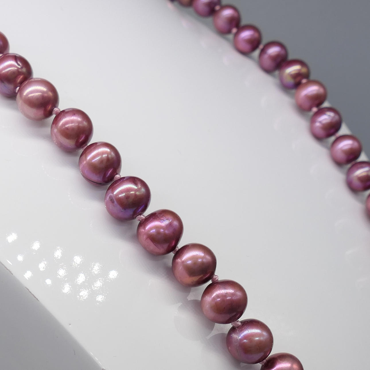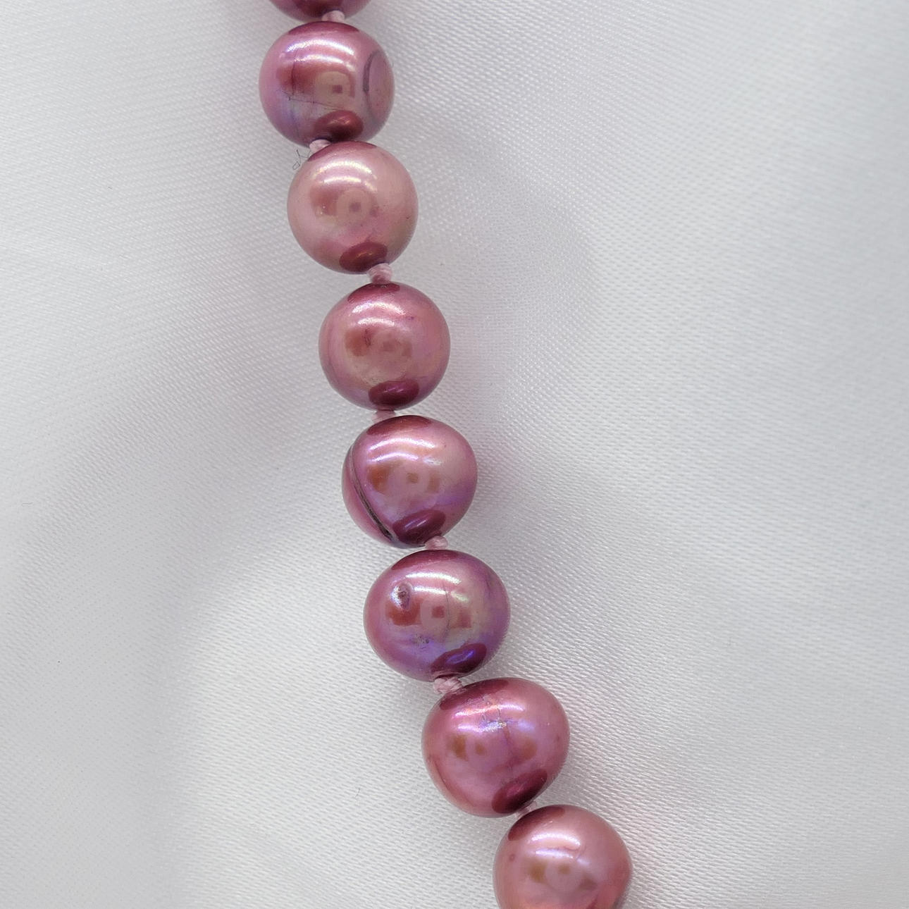 Dessa odlade pärlor är i toner av lila, rött och rosa. De har en genomsnittlig diameter på 6-7 mm.