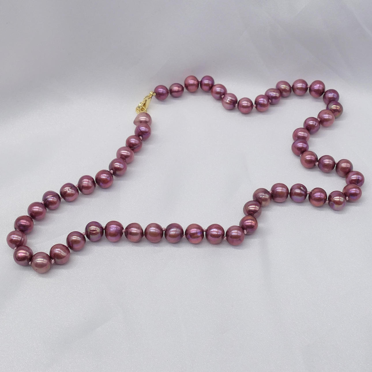 Ett halsband med 54 ekologiskt formade lila och rosa sötvattensodlade pärlor, med guldpläterat lås.