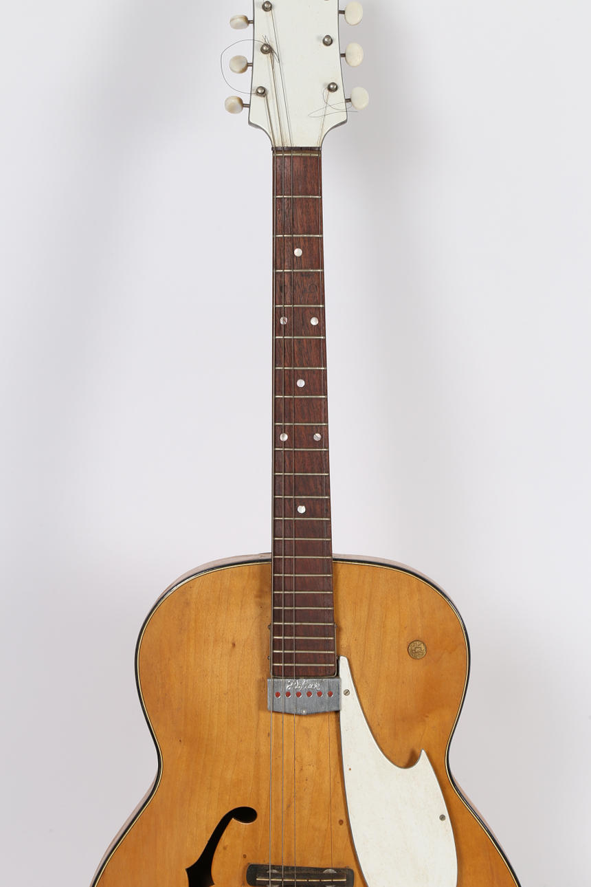 Cirka 1950- och 60-talet, i en naturlig och vit/kromfinish, med en enda flytande pickup av Hofner typ 502. Inga Hofner-markeringar på gitarren, bara pickupen. 107cm längd.