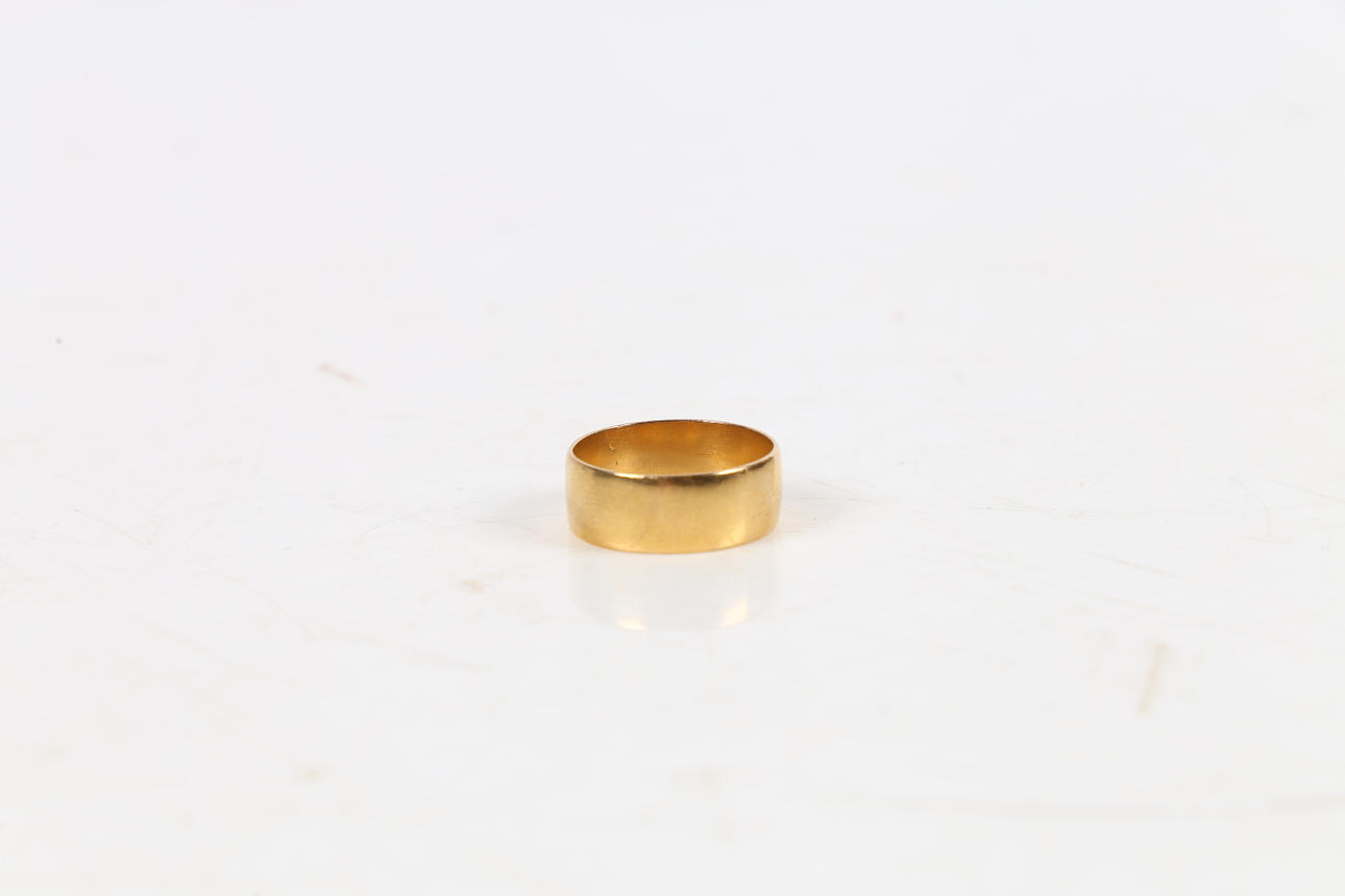 Ett 7,4 mm brett platt slätt band, fingerstorlek P.5 framkant. Vikt 5.9g.