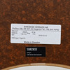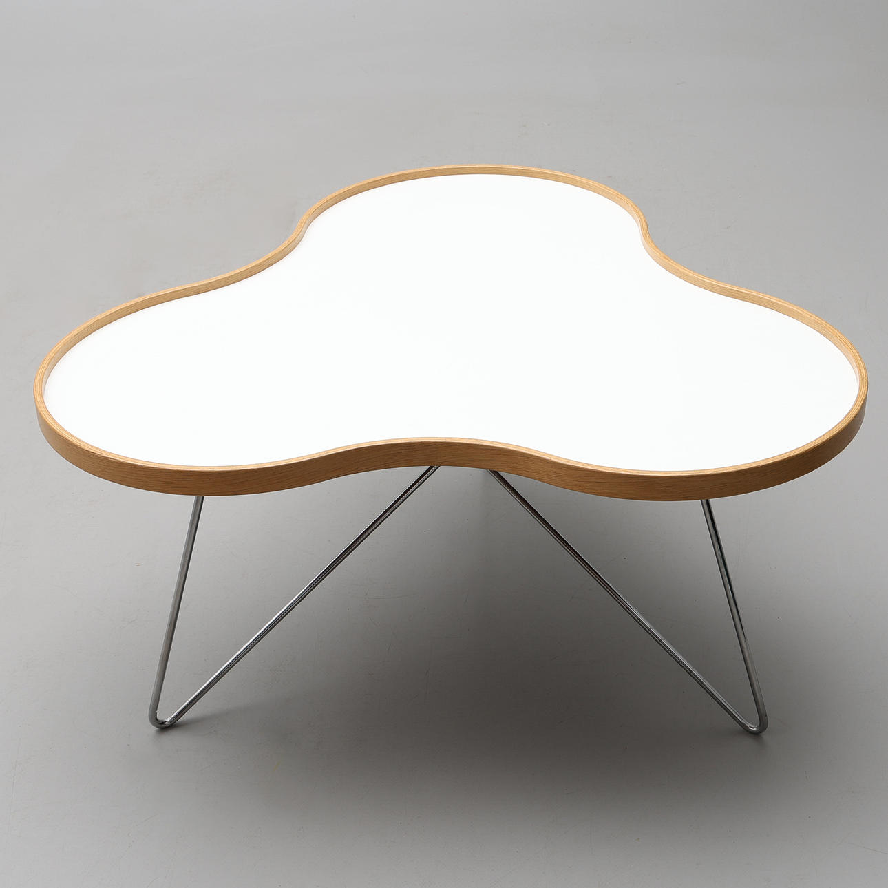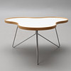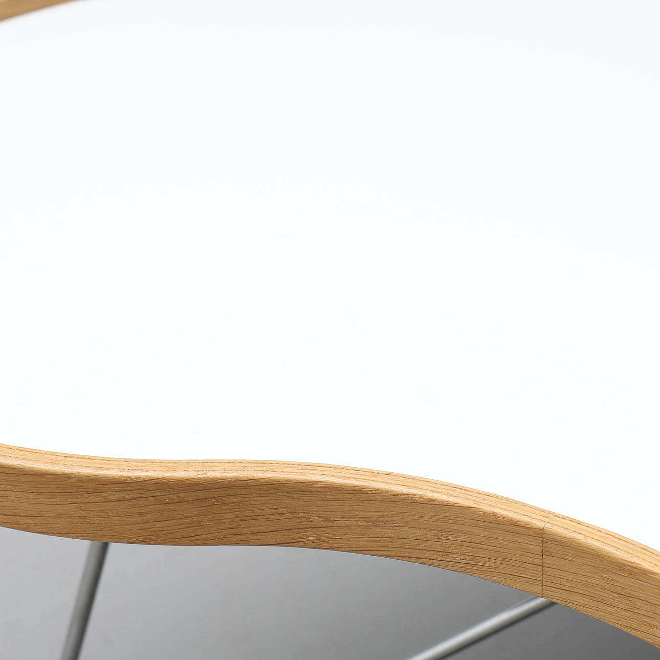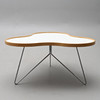 Etikettmärkt. Vit laminatskiva med sarg i ek och underrede i kromat stål. Ca 90x90, höjd 45 cm.