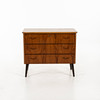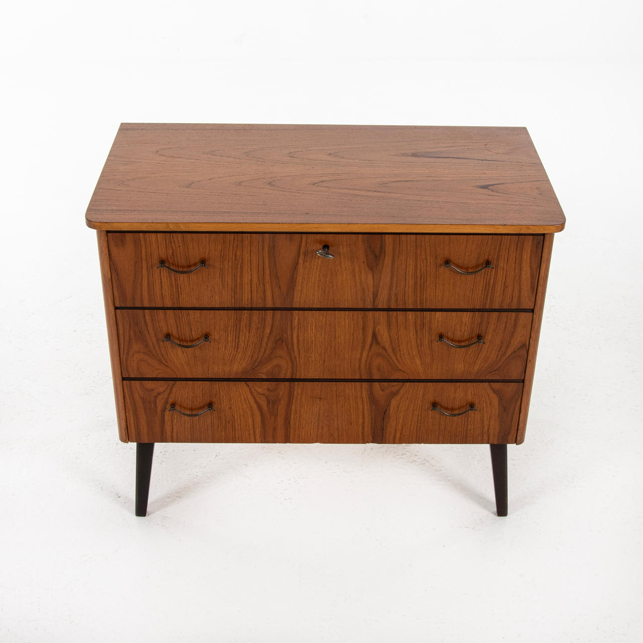 Mindre byrå, tre lådor. Teak, betsade ben i lövträ. Draghandtag i metall. Lås och nyckel. Höjd 69 cm Bredd 80 cm Djup 42 cm.