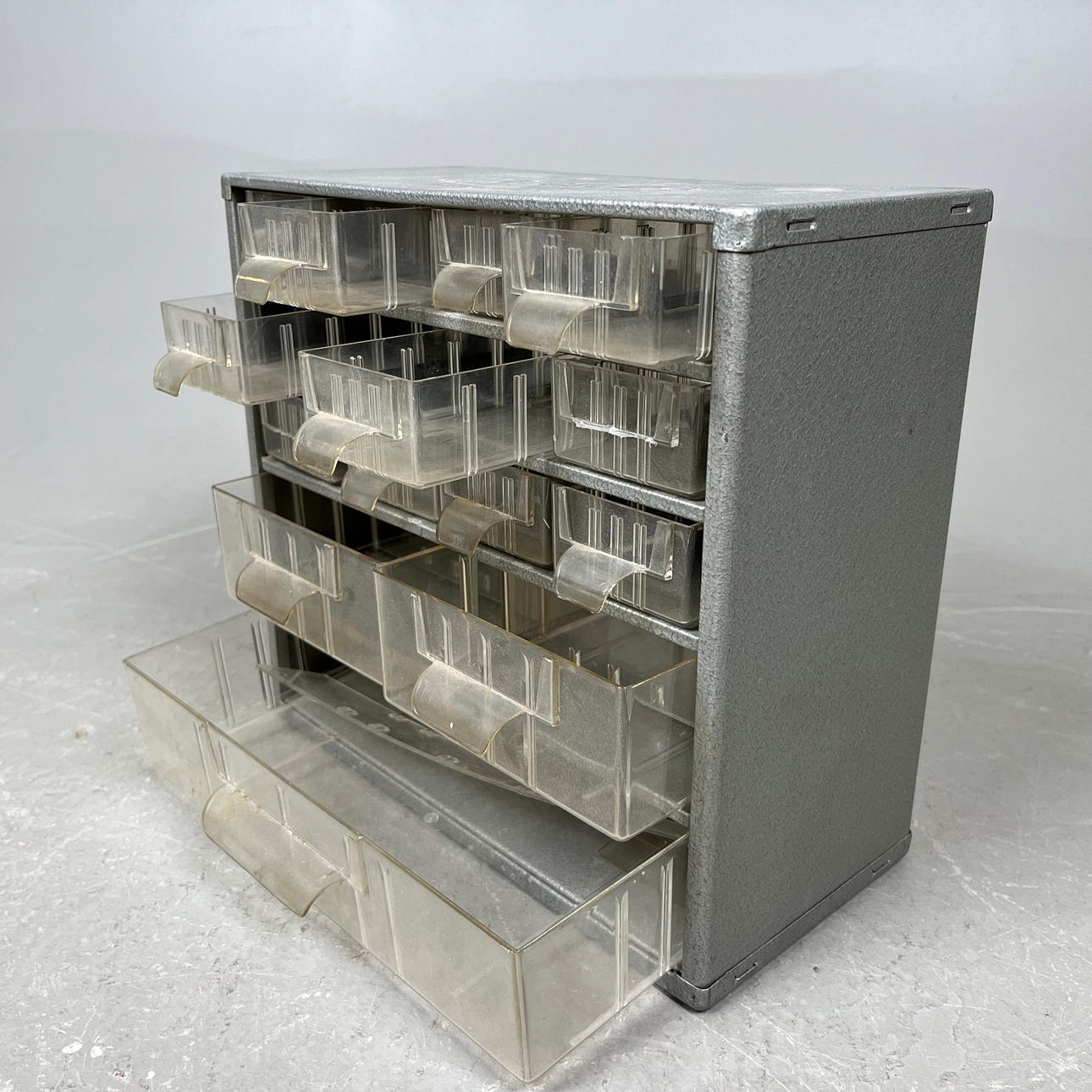 En låda saknas. Bruksslitage, repor, fläckar. Två lådor med skador på handtag.