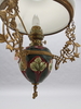 Bronserad metall. Kåpa i majolika med dekor av blommor. Höj- och sänkbar. Höjd 59 cm bredd 36 cm.