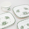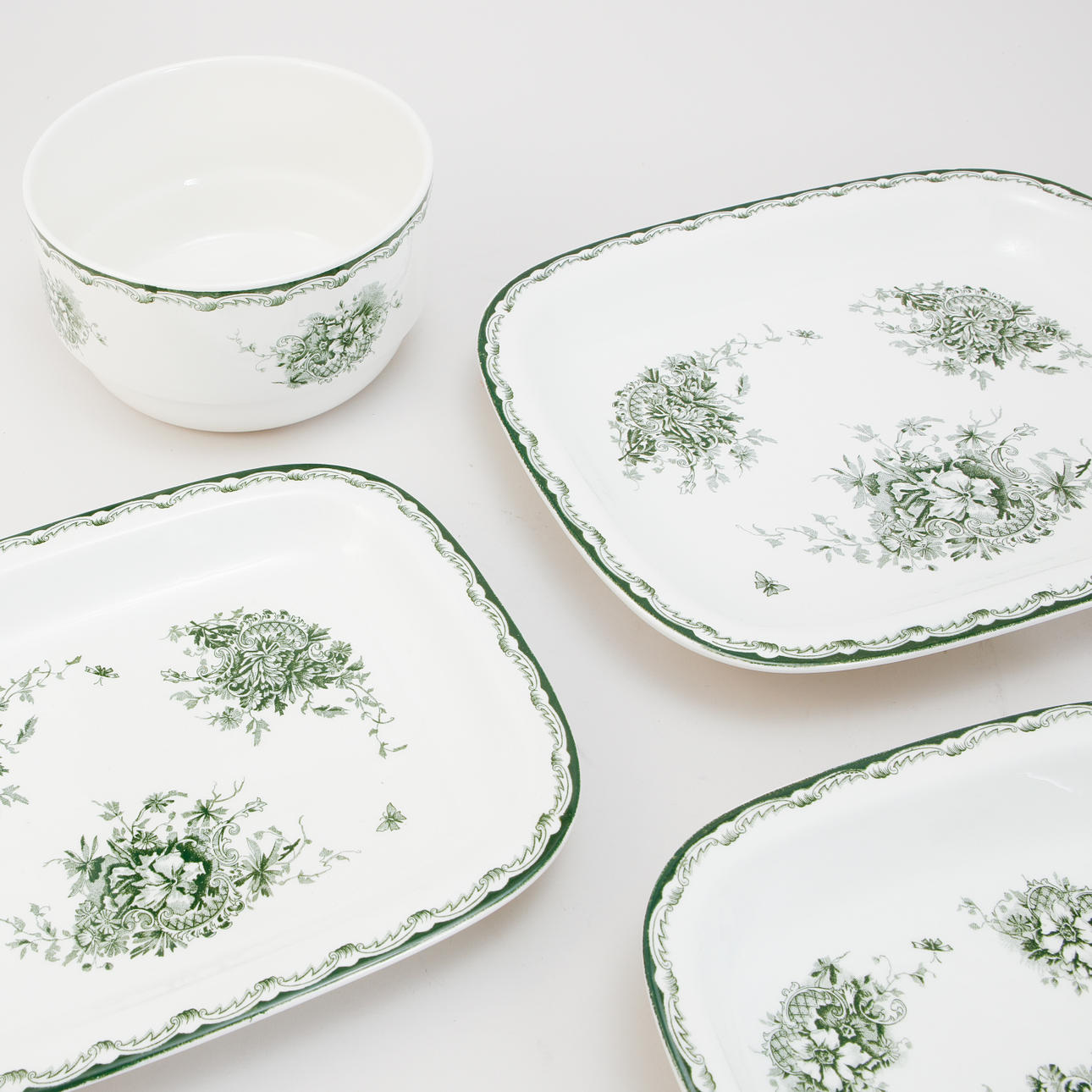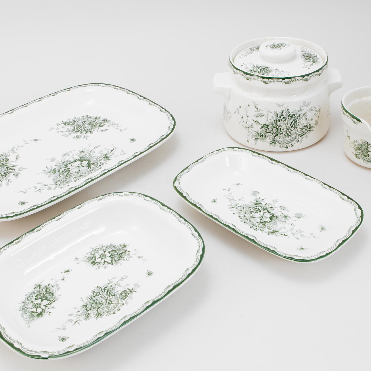 12 mattallrikar, 9 djupa, 12 förrätt, 11 assietter, 4 uppläggningsfat, 1 skål, 1 såskanna, 1 karott.