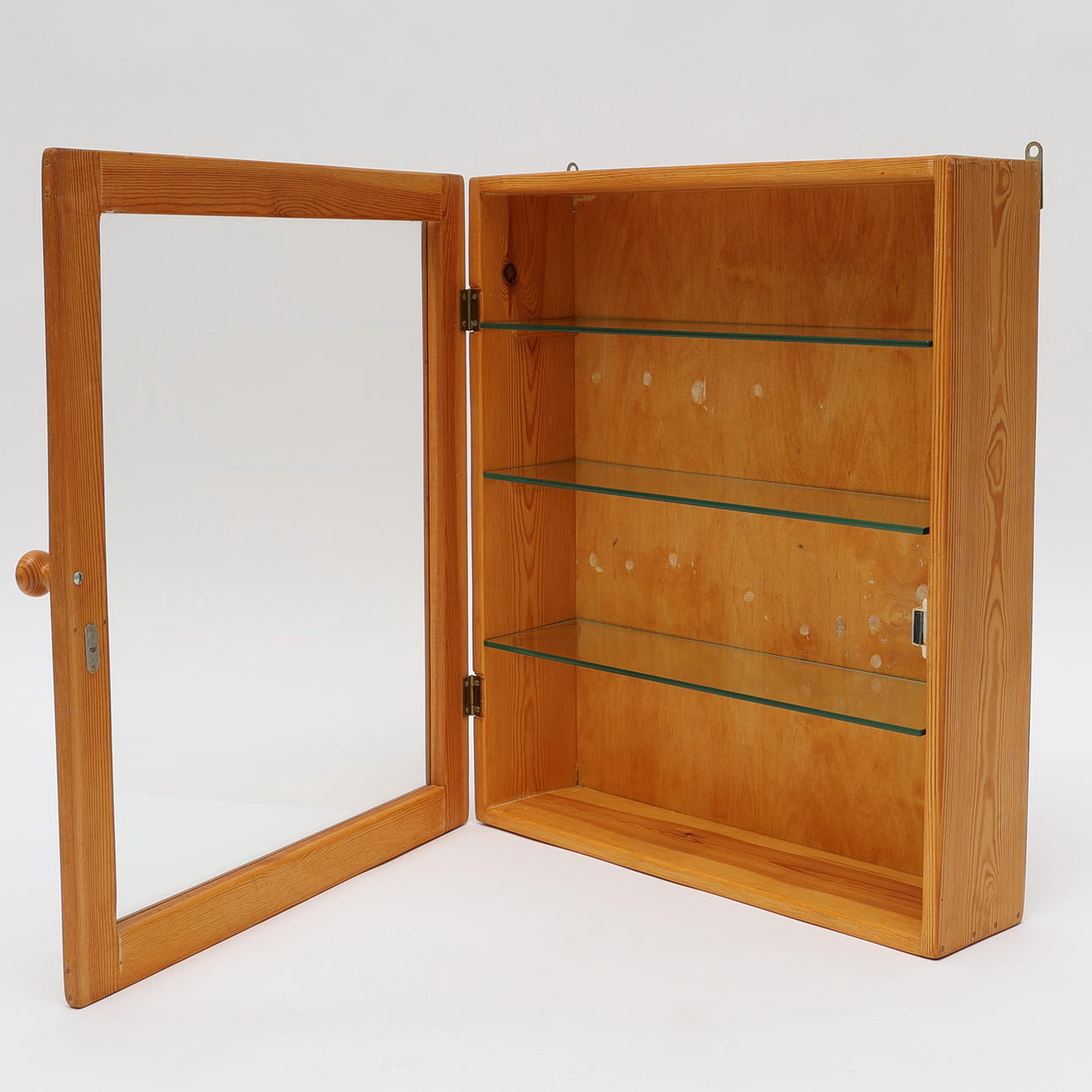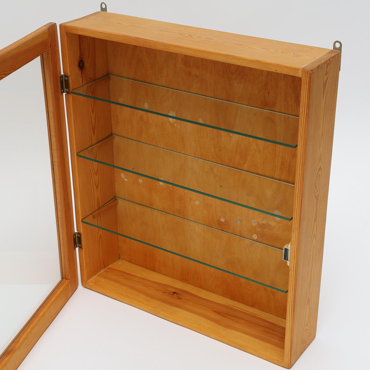 Monterskåp, väggfäste, 3 hyllor i glas. Höjd 61 cm, bredd 52 cm, 14 cm.