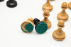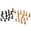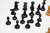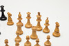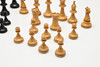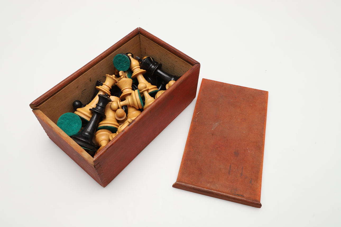 Snidad design och viktad schackpjäsuppsättning, inrymt i en trälåda med skjutlock. Kungstycket mäter 9 cm högt.