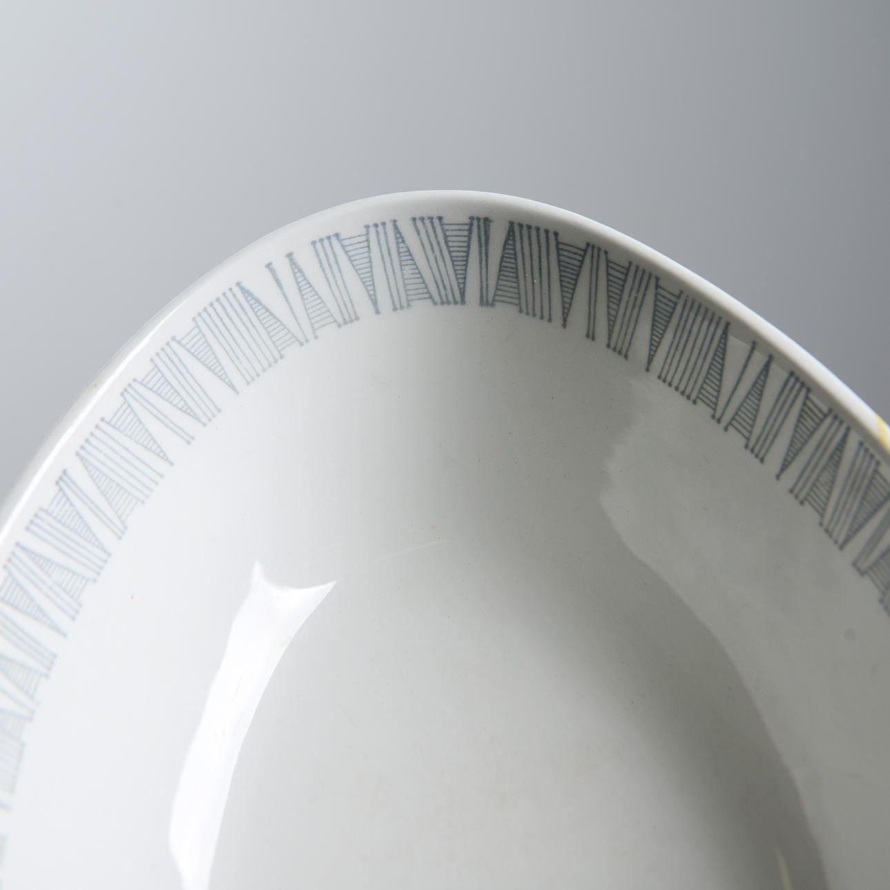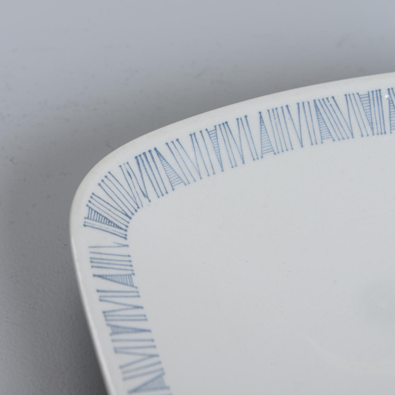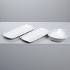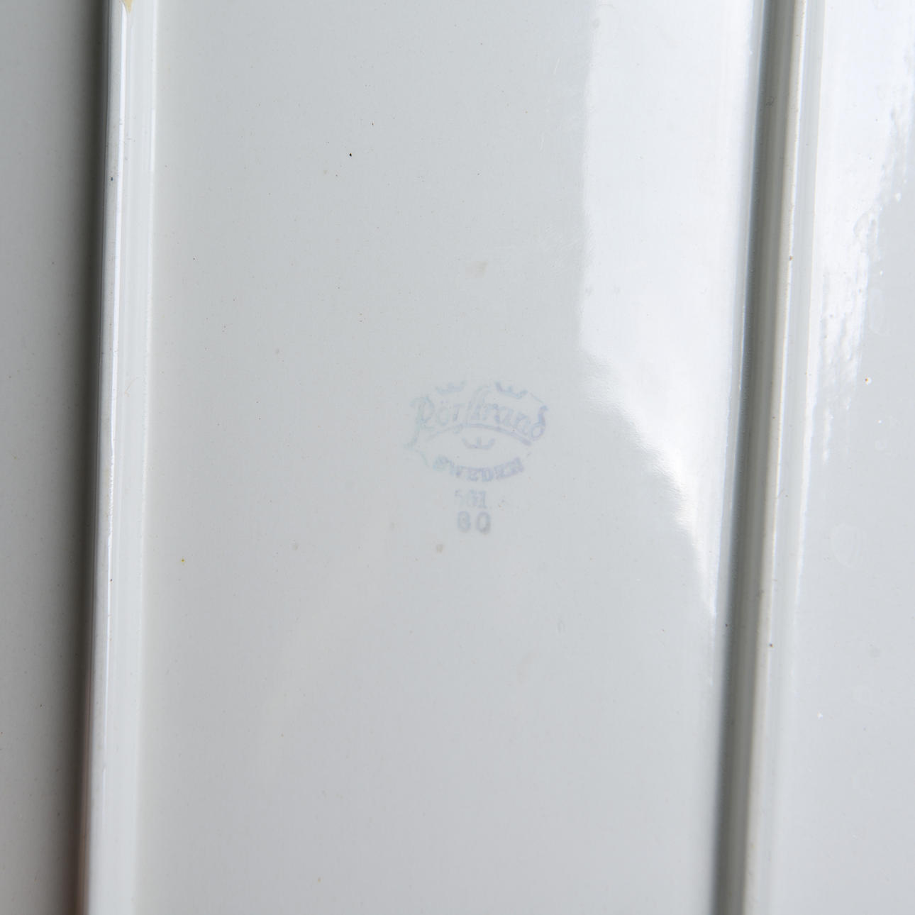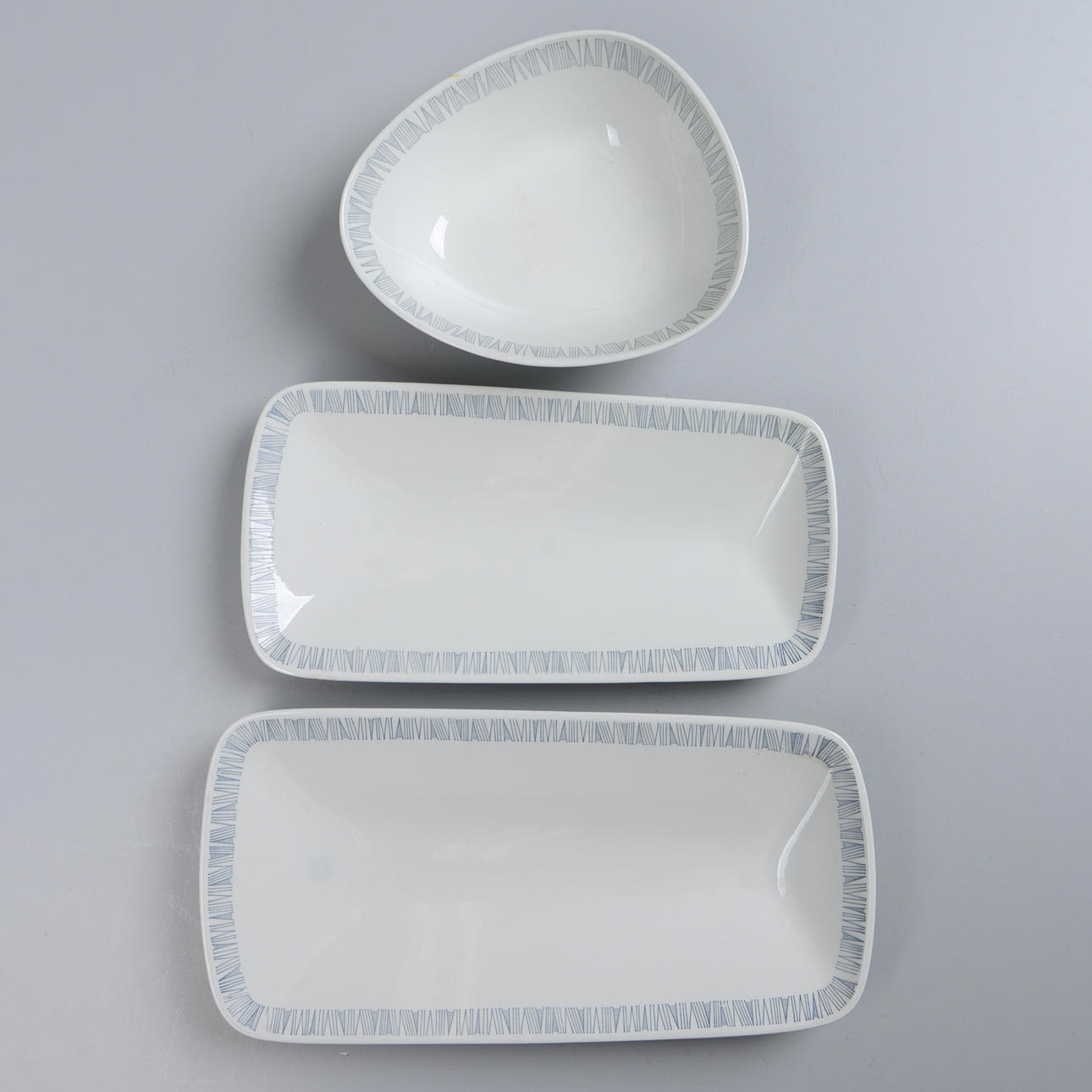 Porslin. Modell formgiven av Carl Harry Stålhane. Uppläggningsfat, 2 st samt serveringsskål. Uppläggningsfatens längd 37-38,5 cm. Skålens diameter 22,5 cm.
