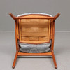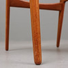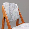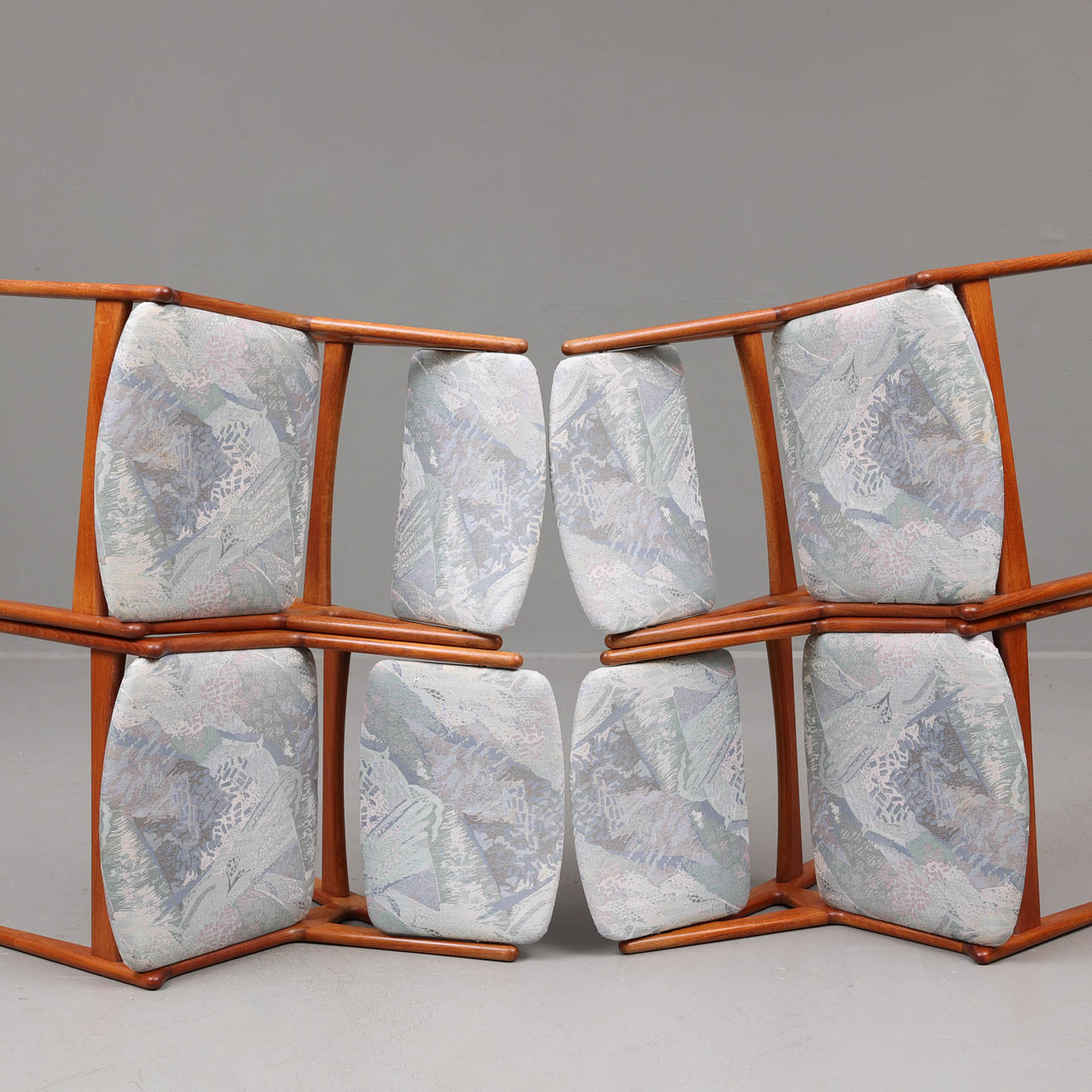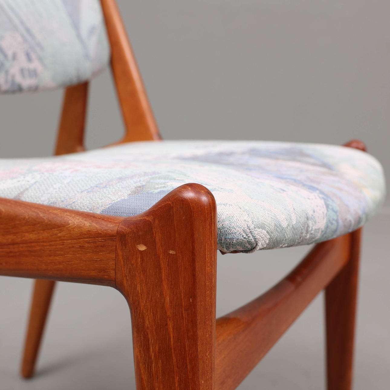 Fyra stolar med stomme i teak, textilklädd sits och ryggbricka med pärlspiksdekor. Brännstämplade